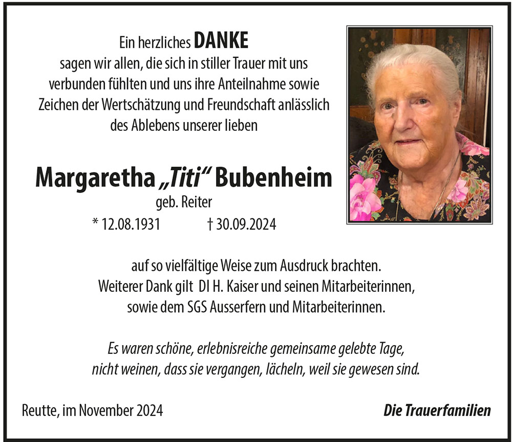 Frau Bubenheim ist heimgegangen, wohlverdient hat sie sich in die Obhut Gottes begeben und viele Erinnerungen hinterlassen. Noch vor wenigen Tagen durften wir mit ihr lachen, über Gott und die Welt sinnieren und an ihren spannenden Geschichten aus einem ausgefüllten Leben teilhaben.