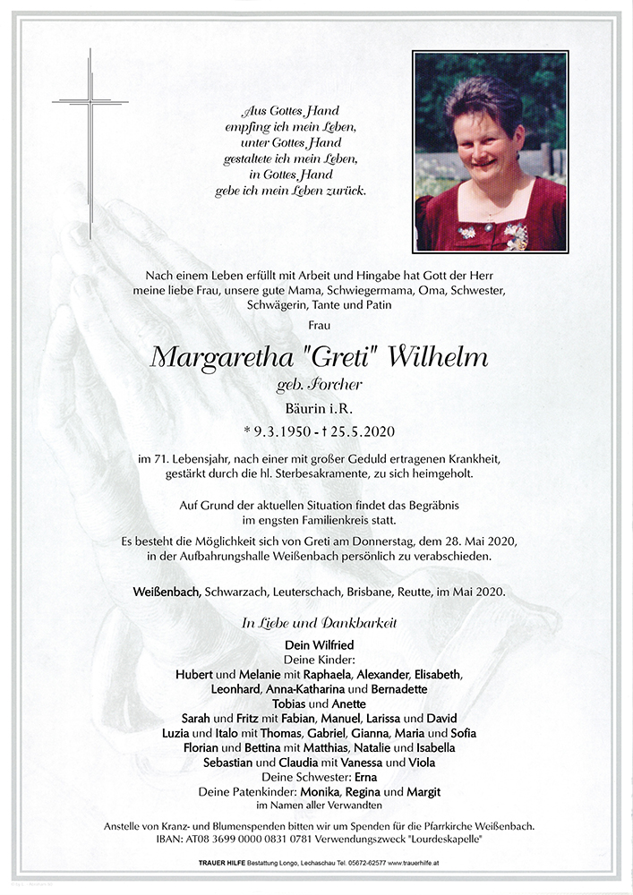 Liebe Greti der Herrgott soll dich belohnen was du für deine Familien getan hast, du hast auch die Mitmenschen nicht vergessen, auch unsere Pfarre nicht, sowie die armen Seelen im Fegefeuer, du hast viele Rosenkränze und Novenen gebetet. Danke dir für dein Vertrauen zu mir, wir haben manches gemeinsam gemacht.