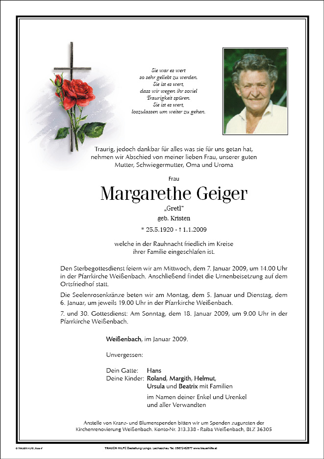 13.12.1901 01.01.2009 Weißenbach am Lech Margarethe Geiger Action Parte Gedenkkerzen Kondolenzen Parte Gedenkkerzen Kondolenzen Parte herunterladen Gedenkkerzen für Margarethe Geiger 0 Einträge Kerze anzünden Ihre Gedenkkerze fürMargarethe Geiger Ihr Name* Farbe auswählen Ihre Nachricht oder Name* E-Mail-Adresse* Mit dem Klicken auf "Kerze anzünden" erklären Sie sich mit unseren Datenschutzbestimmungen einverstanden. Kondolenzbuch für Margarethe Geiger 0 Einträge Kondolenz verfassen Ihr Abschiedsgruß an Margarethe Geiger Ihr Name* E-Mail-Adresse* Ihre Nachricht* Mit dem Klicken auf "Gruß absenden" erklären Sie sich mit unseren Datenschutzbestimmungen einverstanden.