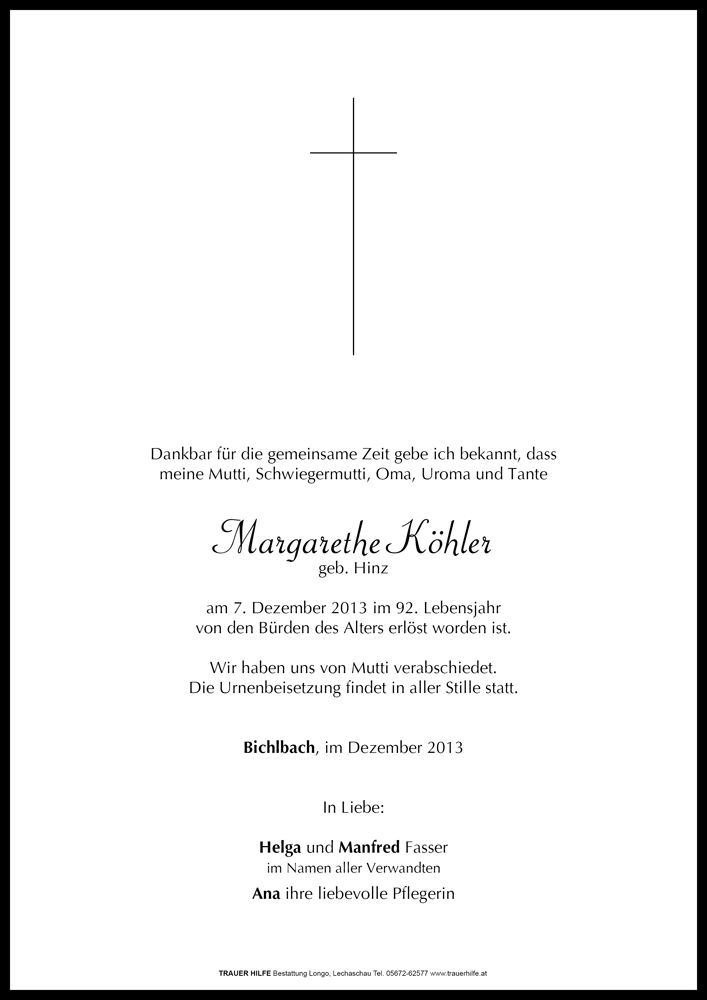 In stiller Erinnerung gedenken wir Frau Köhler und möchten den Angehörigen unser tiefes Mitgefühl ausdrücken. Familie Klar und Degler Robert Klar 11.12.2013 um 19:55 Uhr