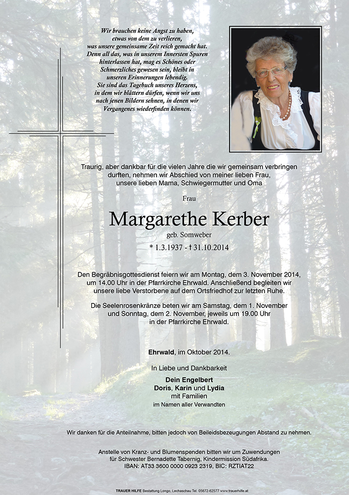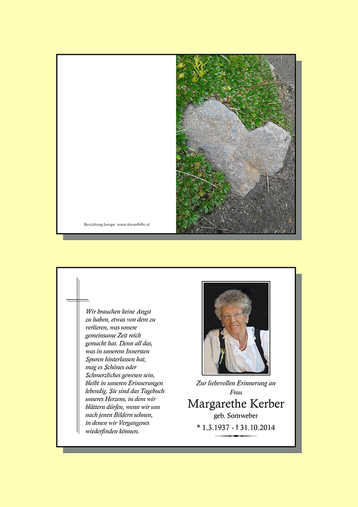 Bleiben werden all die Erinnerungen an viele gemeinsame Erlebnisse, die Ihr mit Marga und mit der Familie teiltet. Bleiben wird auch all das, was Ihr von ihr empfangen habt an Liebe. Zuwendung und Geborgenheit. In diesem Sinne wird sie immer bei Euch sein.