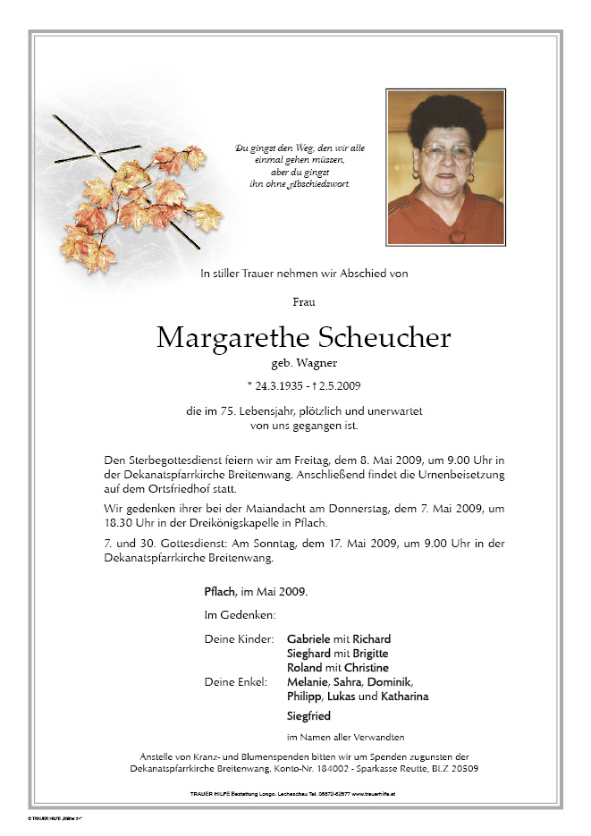 13.12.1901 02.05.2009 Pflach Margarethe Scheucher Action Parte Gedenkkerzen Kondolenzen Parte Gedenkkerzen Kondolenzen Parte herunterladen Gedenkkerzen für Margarethe Scheucher 4 Einträge Kerze anzünden Ein Licht für Dich ich erinnere mich gerne Ruhe in Frieden Barbara und Maria Wörle Ihre Gedenkkerze fürMargarethe Scheucher Ihr Name* Farbe auswählen Ihre Nachricht oder Name* E-Mail-Adresse* Mit dem Klicken auf "Kerze anzünden" erklären Sie sich mit unseren Datenschutzbestimmungen einverstanden. Kondolenzbuch für Margarethe Scheucher 0 Einträge Kondolenz verfassen Ihr Abschiedsgruß an Margarethe Scheucher Ihr Name* E-Mail-Adresse* Ihre Nachricht* Mit dem Klicken auf "Gruß absenden" erklären Sie sich mit unseren Datenschutzbestimmungen einverstanden.