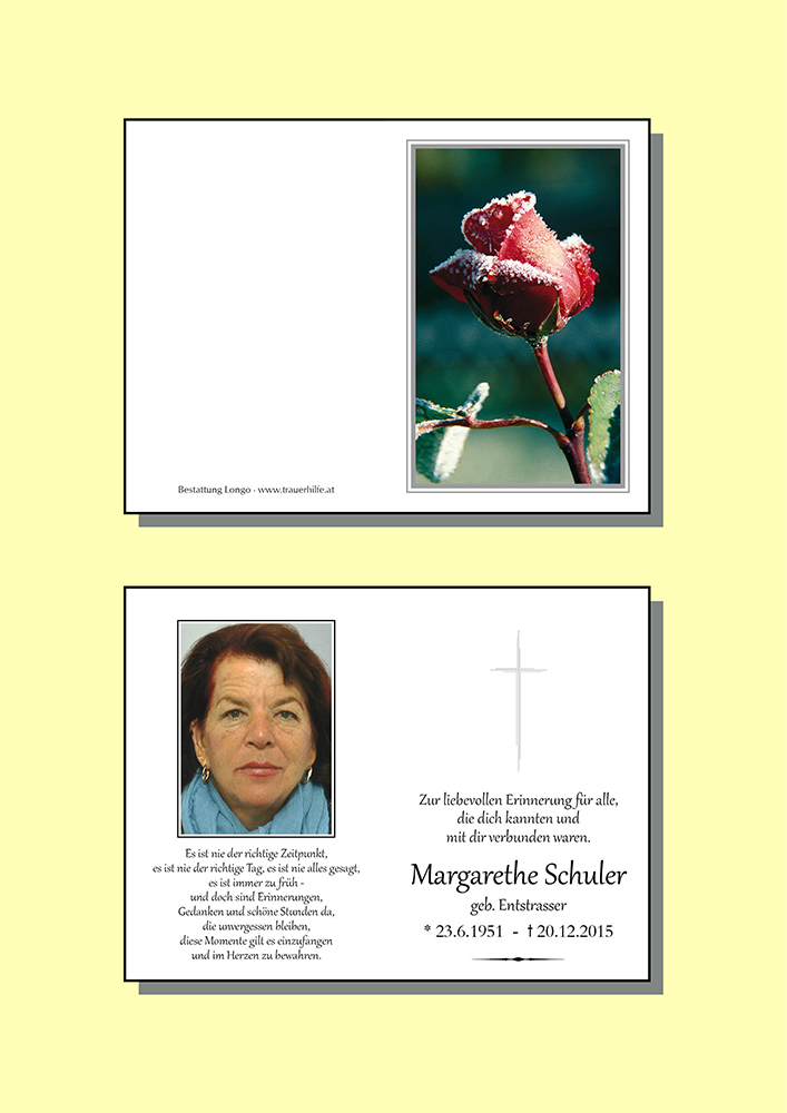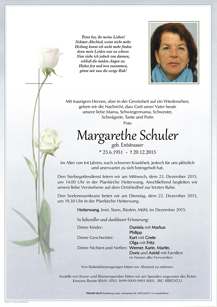 Liebe Daniela! Deine Mutter hat die Schwelle überschritten, die uns alle von der Vollendung trennt. Wir wünschen Dir, dass die Tage des Schmerzes und der Trauer abgelöst werden von der Freude über das Leben in Fülle, das Deiner Mutter jetzt geschenkt ist. Unser aufrichtiges Beileid! Maria u. Hans Kropfitsch