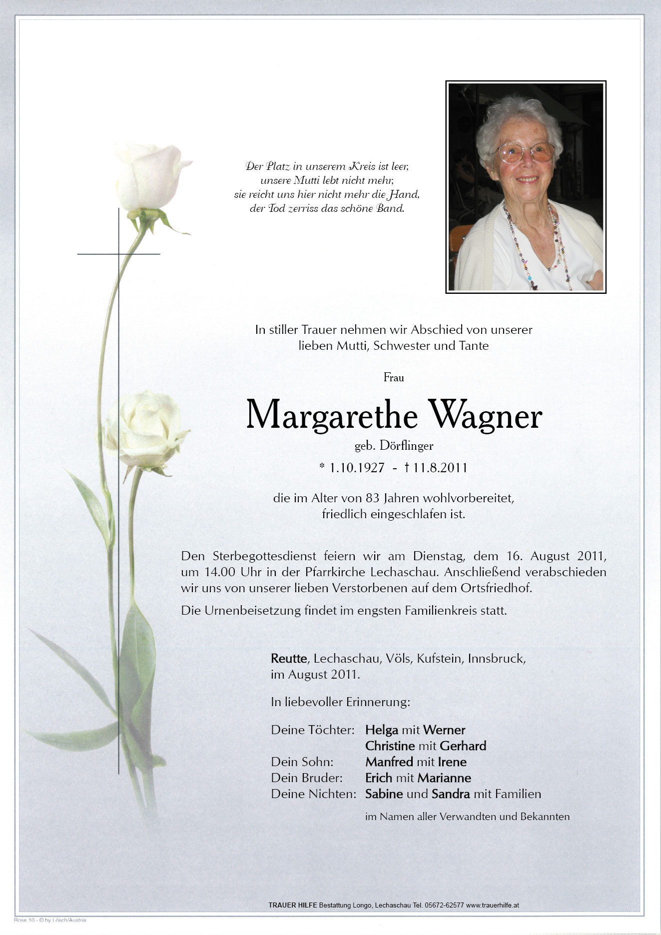 13.12.1901 11.08.2011 Lechaschau Margarethe Wagner Action Parte Sterbebild Gedenkkerzen Kondolenzen Parte Sterbebild Gedenkkerzen Kondolenzen Parte herunterladen Sterbebild herunterladen Gedenkkerzen für Margarethe Wagner 4 Einträge Kerze anzünden A. B A. B. In stillem Gedenken A. B. Bernhard u. Monika Hosp Ihre Gedenkkerze fürMargarethe Wagner Ihr Name* Farbe auswählen Ihre Nachricht oder Name* E-Mail-Adresse* Mit dem Klicken auf "Kerze anzünden" erklären Sie sich mit unseren Datenschutzbestimmungen einverstanden. Kondolenzbuch für Margarethe Wagner 0 Einträge Kondolenz verfassen Ihr Abschiedsgruß an Margarethe Wagner Ihr Name* E-Mail-Adresse* Ihre Nachricht* Mit dem Klicken auf "Gruß absenden" erklären Sie sich mit unseren Datenschutzbestimmungen einverstanden.