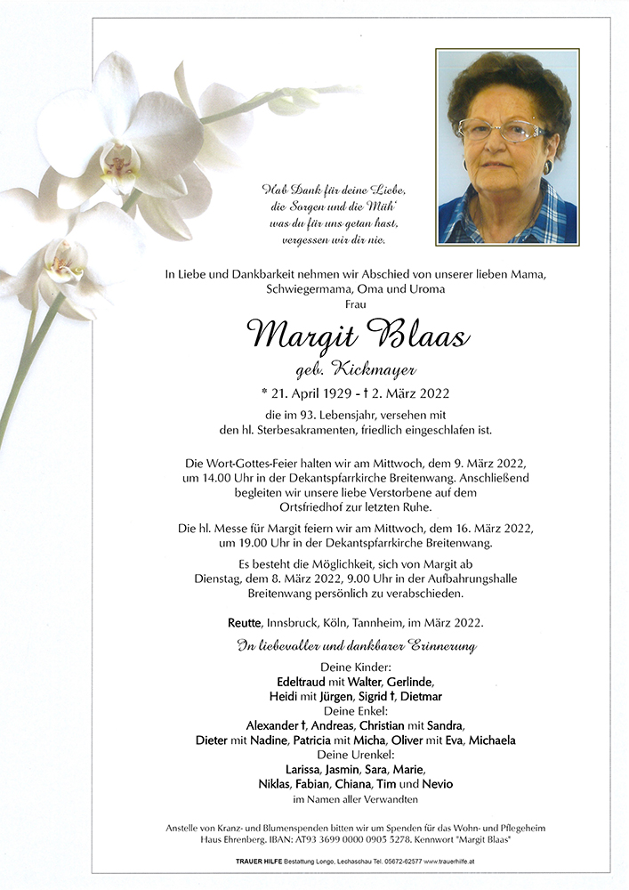 Wir wünschen der gesamten Familie in der Gemeinschaft auf diesem Wege die Kraft, alle Erinnerung über das Trennende stellen zu können, um diesen schmerzlichen Verlust mit Gottes Hilfe zu bewältigen.