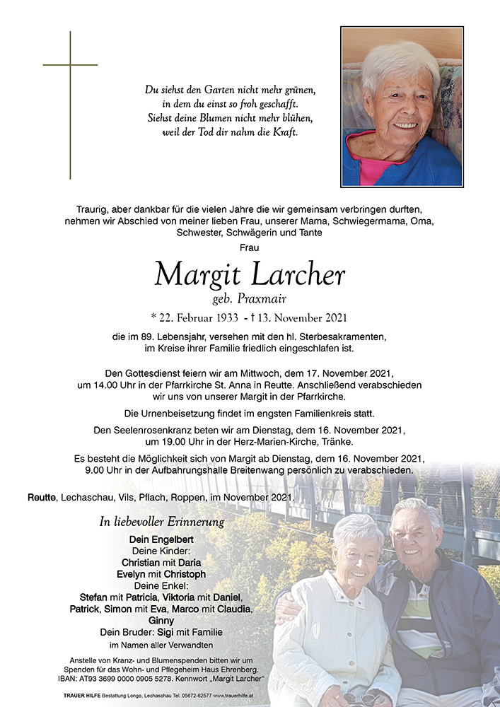 Wir möchten euch auf diesem Wege unser aufrichtiges Beileid zum Ableben von Margit aussprechen.
