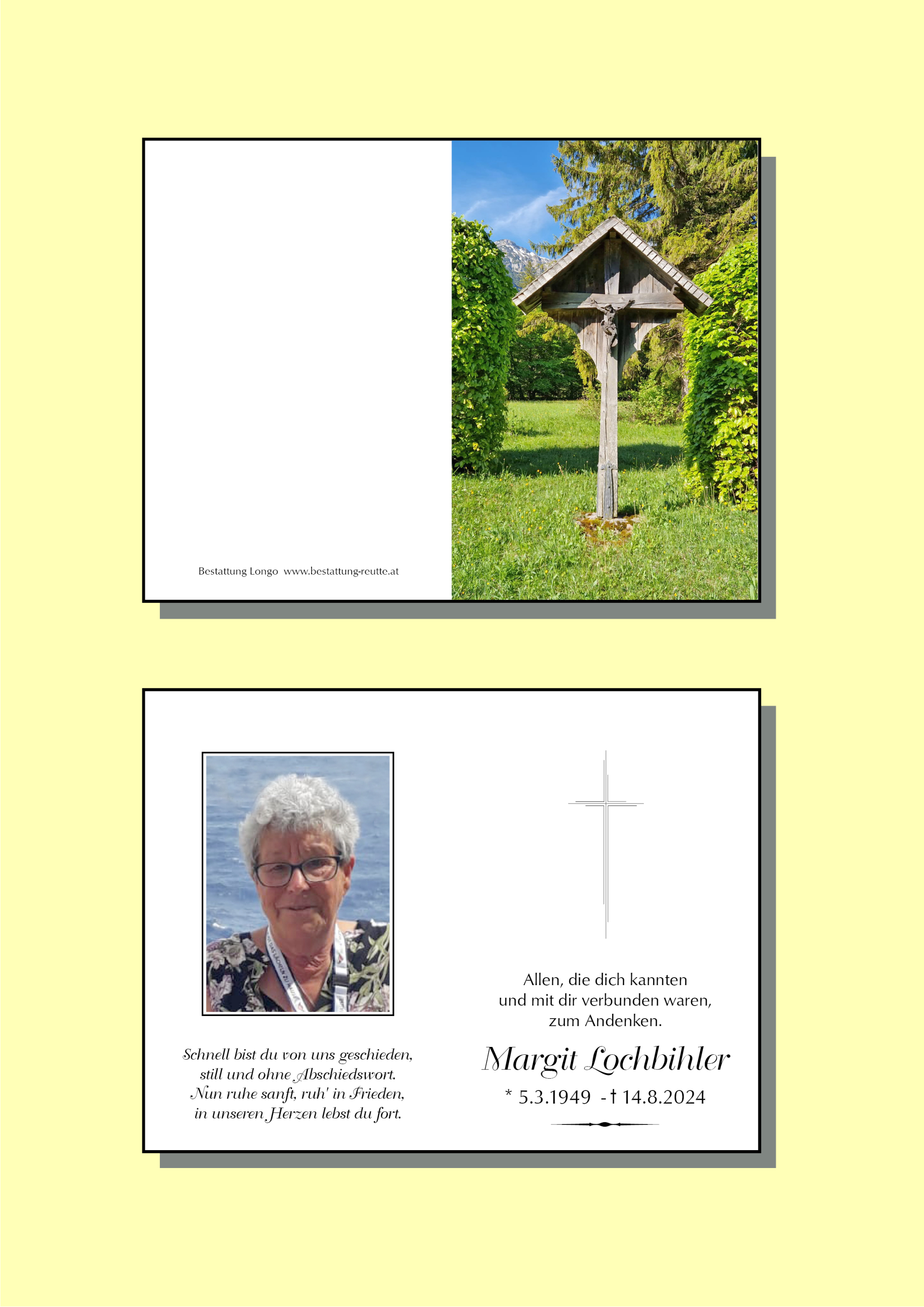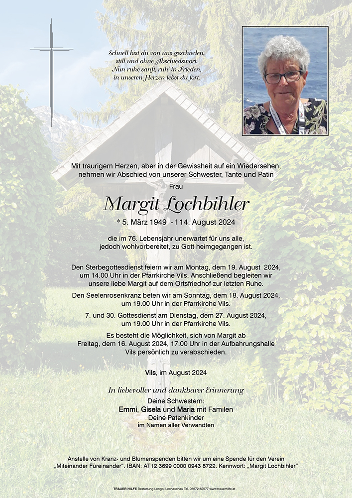 Mit großer Bestürzung habe ich vom Tod eurer Schwester Margit erfahren. Zu diesem Verlust möchte ich euch mein tiefes, aufrichtiges Beileid ausdrücken. Ich werde sie als lebensfrohen und aufrichtigen Menschen in Erinnerung behalten.“