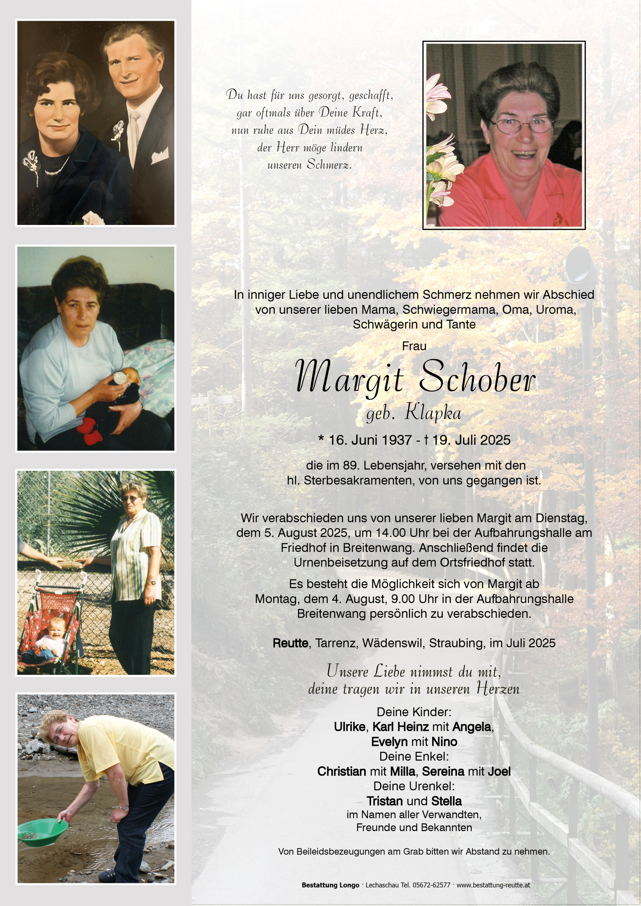 16.06.1937 19.07.2025 Reutte Margit Schober Action Parte Sterbebild Gedenkkerzen Kondolenzen Parte Sterbebild Gedenkkerzen Kondolenzen Parte herunterladen Sterbebild herunterladen Gedenkkerzen für Margit Schober 121 Einträge Kerze anzünden Fam. Bernhard und Susanne Posch Familie Manni Vögele Eugen Winkler jun. RIP.Werner und Karin Kößler ?? Rosemarie Schader Alexandra Schretter Ah Lichtl für die u Alle im Himmel Helft Fam. Bernhard und Susanne Posch Ein Licht für die Reise Elisabeth L. Boden Fam. Kerber Roland Heiterwang Marianne Horndacher Familie Claudia und Stephan Hofer Bettina Lob Wolfgang Puntigam Eberharter Peter und Anita Specht Helmuth Fam. Kerber Roland Heiterwang Thomas Frick Ah Lichtl für die u Alle im Himmel Helft Andrea und Günther Remling Marion Scheucher Lore Scheucher Zotz Tanja?✨️ Ruhe in Frieden Margit Aufrichtige Anteilnahme Margot Wex Helga Kemenater Mario und.Barbara Rief Fam Petra Zellermayr Ruhe in Frieden ? Gerti Singer Manfred&Trixi Kerber herbert,ute,larissa Erika Andreas & Manuela Winkler RIP Claudia Stadler Andy Greßl mit Familie ?️ Gerhard Lacher Bettina Germann Andreas Djeric Karin Gruber (Bader) Fam. Severin & Alexandra Braun Ulrike Jäger Fam. Schlag Hiasl Müller Karin & Wolfgang Müller Lutz Maria Konni Nessler ? Martin & Sandra Paulweber Koch Gabi Elfie Schlux Antonia Strauß Schneier Heidi Fam.Streif ruhe in Frieden! Fritz Bubendorfer Annemarie & Bruno HAUG RIP Unsinn Antonia und Helene m. Familie RIP.Werner und Karin Kößler ?? Ein Licht aus Höfen Fick Renate Ruhe in Frieden Ruhe in Frieden Greti Girl Petra Gehring Elmar Paul und Veronika Kerber Zdenko und Ulli Busic Klaudia Scheidle Michael Steiner Familie Anton Specht Alexandra Pauckner Bernhard Zaggl Familie Christoph Salvenmoser Wex Petra Christian Strauß Julia Gruber Seniorenzentrum Haus zum guten Hirten Waltraud und Othmar Wagner Karin Posch Anita Schedle ? Fam. Wohlgenannt Stephanie Gitti Unterkofler Hannelore, Martin & Christiane Dreer Fam. Hans und Hilde Gressl Martina & Rainer Jastraunig Herbert & Andrea Frischmann Warger Christine Andi Wiesenegg Otto u.Ingrid Eberharter Nina Hiebl-Steenman mit Familie Frischmann Walter Gabi und Helli Schweigl mit Fam. Fam. Johannes und Gudrun Baumann Petra Wiesneth (Paulweber) Bernhard Sommerlechner Gabi Sailer und Peter Speckbacher Rosmarie und Andrea Rosa Grubmüller Luise & Balu Evi Frischmann Fam.Werner und Andrea Wohlgenannt Heidi Schmid Fam. Sonja und Gerhard Brunner rosi und ingo Andreas Koch Christl Rief Pepi Kogler Susi Huber Alexandra Schretter Brigitte Biechl Fam.Günter&Gitti Muglach Liebe Margit habs fein im Himmel LISI Thomas Mitterberger mit Fam. Fam. Klaus und Sabine Raunegger Ein Licht aus Höfen Christine Strauß mit Familie Herbert &Margret Schlichther Fam. Paul Kaiser Elke und Martin Schöll Ricky und Liane Sylvia Fringer Edi Ammann Karin Schretter Ruhe in Frieden Manuela Bischof Claudia Schreieck TrauerHilfe Bestattung Longo Ihre Gedenkkerze fürMargit Schober Ihr Name* Farbe auswählen Ihre Nachricht oder Name* E-Mail-Adresse* Mit dem Klicken auf "Kerze anzünden" erklären Sie sich mit unseren Datenschutzbestimmungen einverstanden. Kondolenzbuch für Margit Schober 0 Einträge Kondolenz verfassen Ihr Abschiedsgruß an Margit Schober Ihr Name* E-Mail-Adresse* Ihre Nachricht* Mit dem Klicken auf "Gruß absenden" erklären Sie sich mit unseren Datenschutzbestimmungen einverstanden.