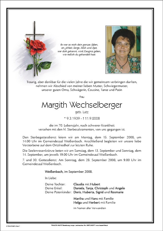 13.12.1901 11.09.2008 Weißenbach am Lech Margith Wechselberger Action Parte Gedenkkerzen Kondolenzen Parte Gedenkkerzen Kondolenzen Parte herunterladen Gedenkkerzen für Margith Wechselberger 6 Einträge Kerze anzünden Doris mit Fam. Doris mit Fam. Doris Ich vermisse dich Doris Du fehlst Helga m. Kinder Ein Licht für dich Helga Ihre Gedenkkerze fürMargith Wechselberger Ihr Name* Farbe auswählen Ihre Nachricht oder Name* E-Mail-Adresse* Mit dem Klicken auf "Kerze anzünden" erklären Sie sich mit unseren Datenschutzbestimmungen einverstanden. Kondolenzbuch für Margith Wechselberger 0 Einträge Kondolenz verfassen Ihr Abschiedsgruß an Margith Wechselberger Ihr Name* E-Mail-Adresse* Ihre Nachricht* Mit dem Klicken auf "Gruß absenden" erklären Sie sich mit unseren Datenschutzbestimmungen einverstanden.