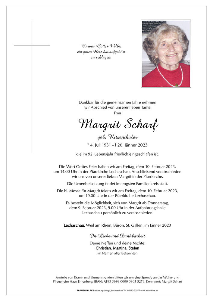 04.07.1931 26.01.2023 Lechaschau Margrit Scharf Action Parte Sterbebild Gedenkkerzen Kondolenzen Parte Sterbebild Gedenkkerzen Kondolenzen Parte herunterladen Sterbebild herunterladen Gedenkkerzen für Margrit Scharf 66 Einträge Kerze anzünden ein Licht zum Jahresgedenken RUHE IN FRIEDEN Inge und Pepi luisi mit Familie u. Familie Peintner Wilhel RUHE IN FRIEDEN -Johann u. Heidi Durst Fam. Eugen und Charlotte Ladner Ruhe in Frieden Robert und Gerda Müller Helga Singer Erika Gargitter mit Familie Johanna Lettenbichler Klaudia Schmid Barbara Schweißgut ✨️ Fam. Claudia u. Wolfgang Preindl Ein Licht für die Reise. Olivia Ingrid und Klaus Wagner Fam. Genoveva u. Walter Preindl Letzte Grüße Gerda Schennach Anita Wibmer ? Lisa Mair Ruhe in Frieden Ruhe in Frieden REINHARD BERTLMANN Pia Zobl Ein Licht für Dich Jutta & Norbert Payr Elisabeth Lipp Mario u. Barbara Rief Renate u.Franz Reinisch Norbert Beirer Josef Niggl Ruhe in Frieden Familie Martin Müller Maria Müller Zöblen Annemarie Gerber Martha und Heidi Winkler mit Familie Elfie Schlux Senioren Tannheim-Schattwald-Zöblen Klaus und Hannelore Witting Silvia Häsele Familie Anton Specht Tanja Jäger Lisl Roswita Leuprecht Elfriede und Richard Huber Brigitte Wachter Familie Rita Müller Zöblen Birgit und Christian Stecher mit Familie Fam.Schweißgut Otto und Waltraud Ruhe in Frieden Brigitte Glätzle Walter & Margret Burkert,Ruhe in Frieden Ein Licht begleitet dich Paul Huemer R.I.P. Elisabeth Weirather Reinhold Heiserer Inge und Guntram Pürstl Fam . Günther Haberl Ruhe in Frieden Julia Gruber Ruhe in Frieden Robert und Marlen Schweiger Michael Fam.Stefan Beirer Margarete u.Emmerich Lutz Bernhard und Christine Helfer Ursula Leuprecht Lukas Schmitt Claudia Schreieck TrauerHilfe Bestattung Longo Ihre Gedenkkerze fürMargrit Scharf Ihr Name* Farbe auswählen Ihre Nachricht oder Name* E-Mail-Adresse* Mit dem Klicken auf "Kerze anzünden" erklären Sie sich mit unseren Datenschutzbestimmungen einverstanden. Kondolenzbuch für Margrit Scharf 0 Einträge Kondolenz verfassen Ihr Abschiedsgruß an Margrit Scharf Ihr Name* E-Mail-Adresse* Ihre Nachricht* Mit dem Klicken auf "Gruß absenden" erklären Sie sich mit unseren Datenschutzbestimmungen einverstanden.