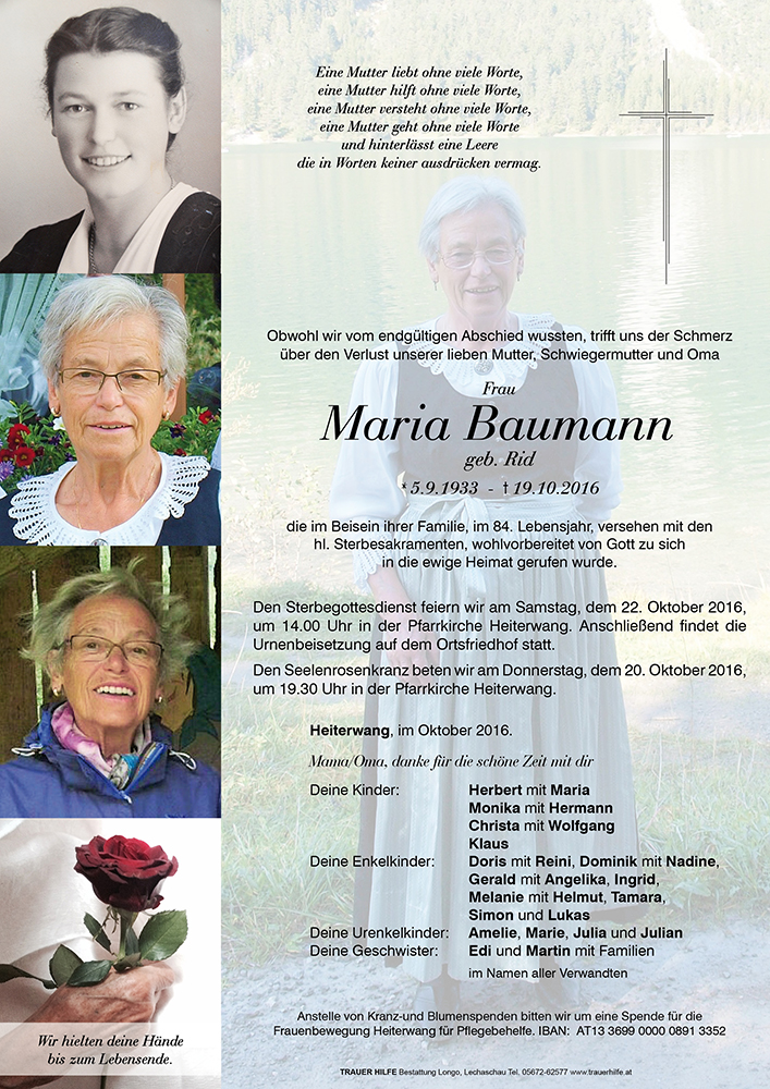am Ableben euer Mutter und unserer langjährigen Funktionärin in der Organisation der Bäuerinnen spreche im Namen der Bezirks Landwirtschaft Kammer mein aufrichtiges Beileid aus.