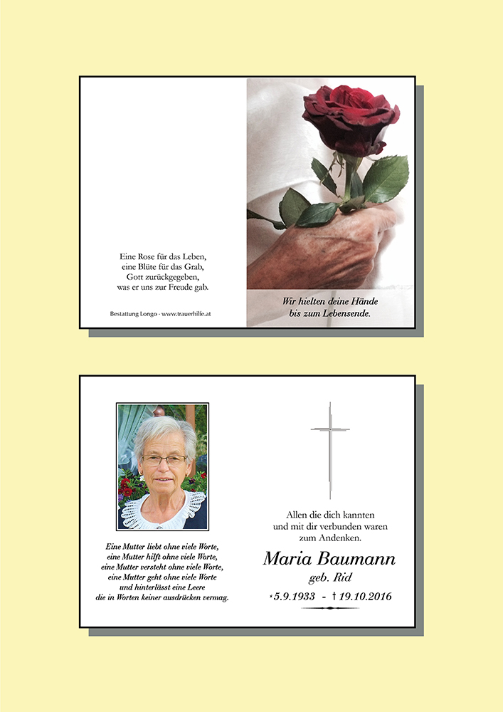 Nach einem erfüllten Leben durfte nun deine Mama heimgehen, wo sie sicher schon erwartet wird. Ihr habt sie umsorgt und auf den letzten Weg begleitet. Das soll euch Trost sein in eurer Trauer.