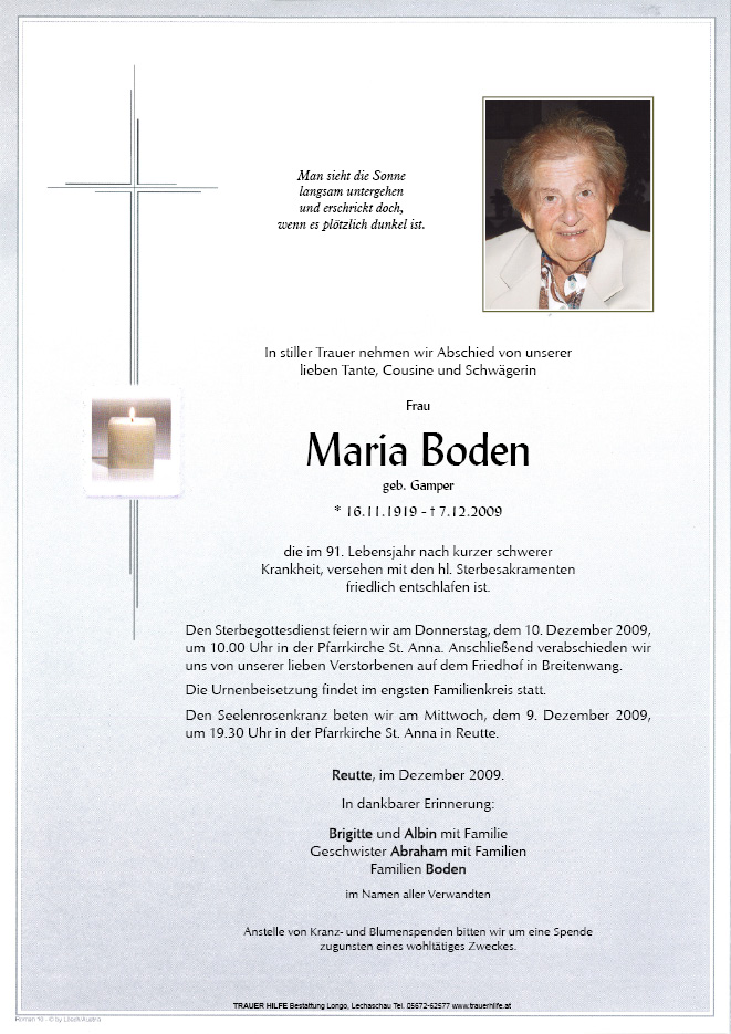 13.12.1901 07.12.2009 Reutte Maria Boden Action Parte Gedenkkerzen Kondolenzen Parte Gedenkkerzen Kondolenzen Parte herunterladen Gedenkkerzen für Maria Boden 0 Einträge Kerze anzünden Ihre Gedenkkerze fürMaria Boden Ihr Name* Farbe auswählen Ihre Nachricht oder Name* E-Mail-Adresse* Mit dem Klicken auf "Kerze anzünden" erklären Sie sich mit unseren Datenschutzbestimmungen einverstanden. Kondolenzbuch für Maria Boden 0 Einträge Kondolenz verfassen Ihr Abschiedsgruß an Maria Boden Ihr Name* E-Mail-Adresse* Ihre Nachricht* Mit dem Klicken auf "Gruß absenden" erklären Sie sich mit unseren Datenschutzbestimmungen einverstanden.