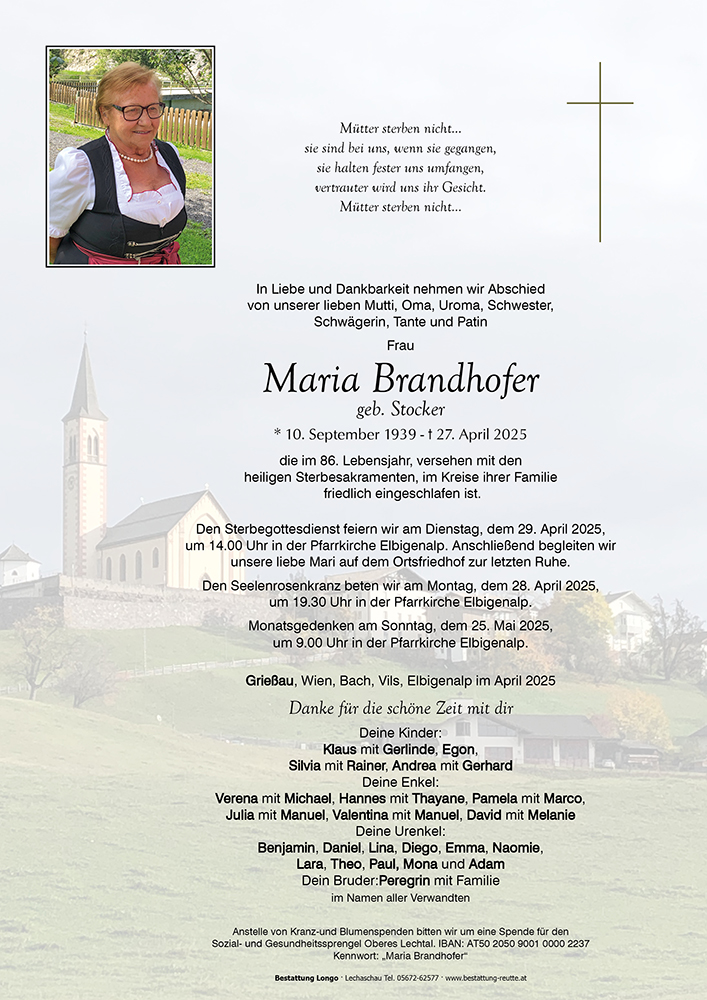 Es ist schwer die richtigen Worte zu finden, wenn ein liebes Familienmitglied gestorben ist. Wir möchten euch unser aufrichtiges Beileid wünschen und sind uns sicher, dass Maria zwar von Erden gegangen ist, aber in euren Herzen ewig weiter leben wird!