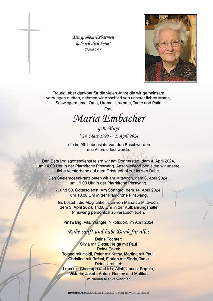 Der Lebenskreis von Maria ist nach einem langen Leben vollendet und sie ist auf dem Weg zu ihrer ewigen Heimat.