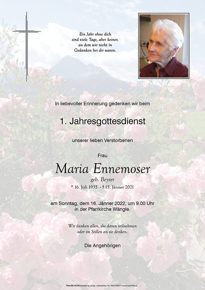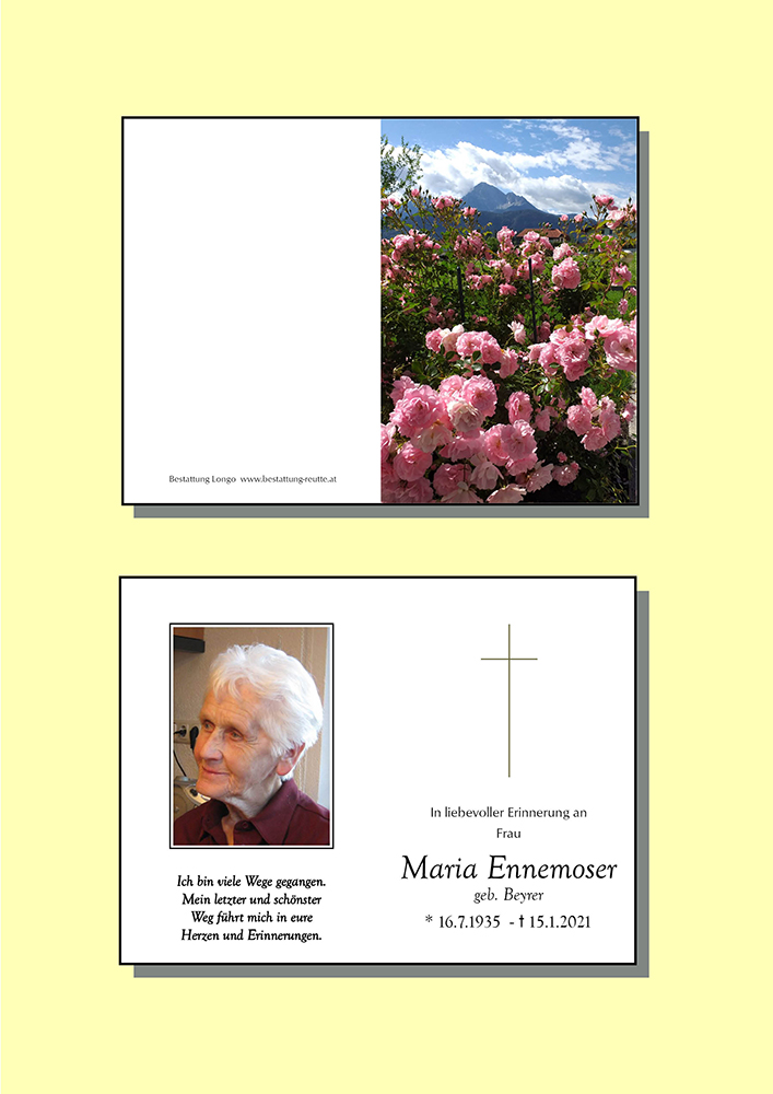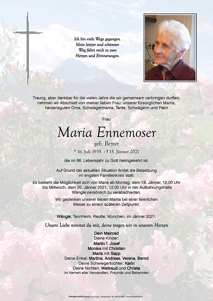 Liebe Familie Ennemoser, es tut mir sehr leid, dass ihr euch von eurer Mama und Frau verabschiedet musstet, sie wird für immer in euren Herzen sein.