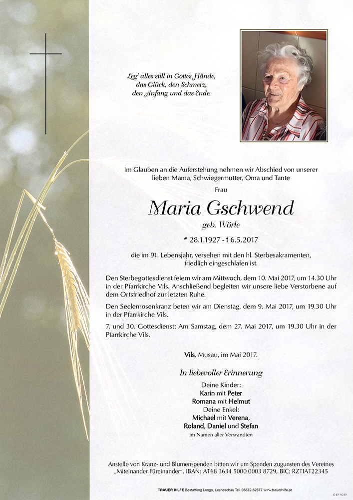 Wir danken ihr für das Leben, die Zuwendung und die Liebe.