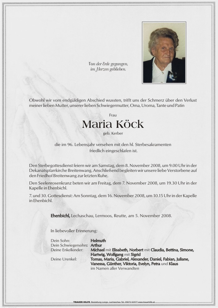 13.12.1901 05.11.2008 Ehenbichl Maria Köck Action Parte Gedenkkerzen Kondolenzen Parte Gedenkkerzen Kondolenzen Parte herunterladen Gedenkkerzen für Maria Köck 0 Einträge Kerze anzünden Ihre Gedenkkerze fürMaria Köck Ihr Name* Farbe auswählen Ihre Nachricht oder Name* E-Mail-Adresse* Mit dem Klicken auf "Kerze anzünden" erklären Sie sich mit unseren Datenschutzbestimmungen einverstanden. Kondolenzbuch für Maria Köck 0 Einträge Kondolenz verfassen Ihr Abschiedsgruß an Maria Köck Ihr Name* E-Mail-Adresse* Ihre Nachricht* Mit dem Klicken auf "Gruß absenden" erklären Sie sich mit unseren Datenschutzbestimmungen einverstanden.