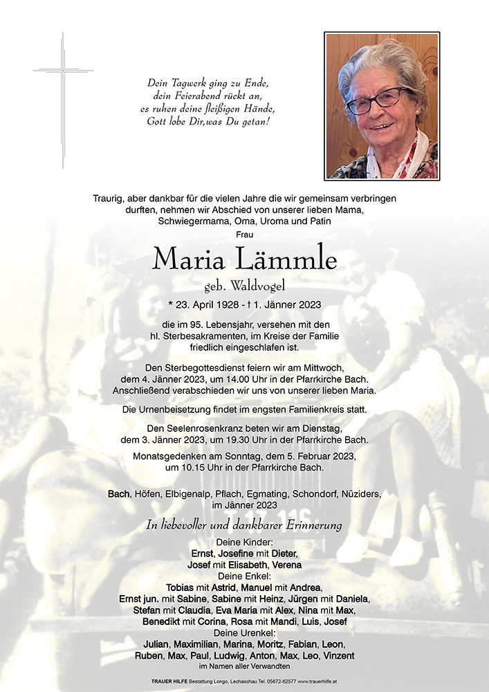 In tiefer Anteilnahme nehmen wir Abschied von "Mariale". Sie wird uns stets als großartige Frau und Mutter, sowie als herzensgute, frühere Nachbarin in Höfen in bester Erinnerung bleiben.