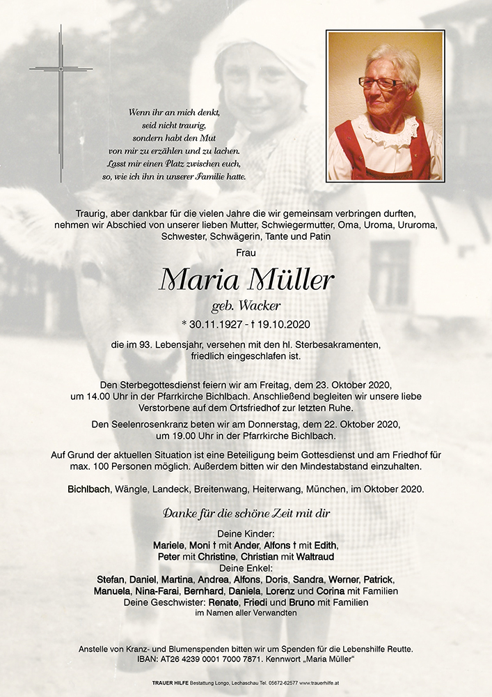 Lieber Christian, lieber Peter, liebe Trauerfamilie, wir haben eure Mama als lieben naturverbundenen Menschen kennengelernt, und schöne Stunden im Hof mit ihr verbracht. Maria ruhe in Frieden.