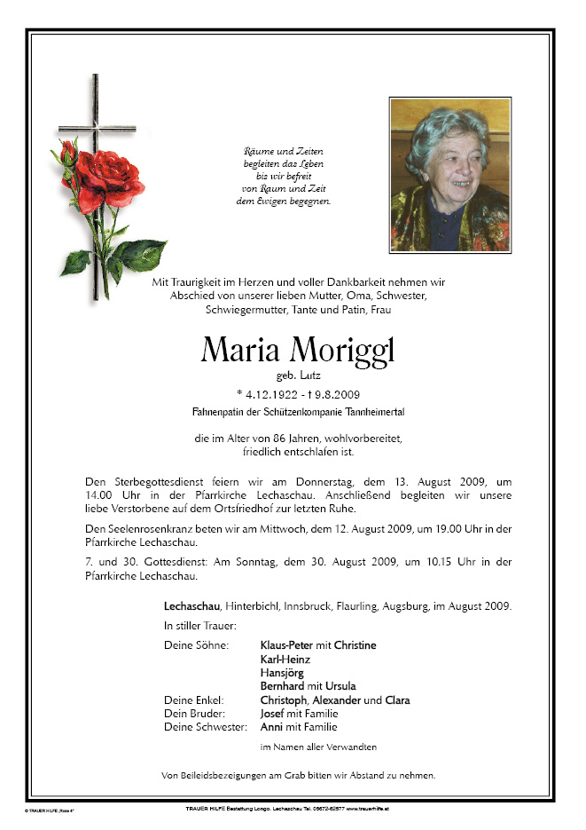 13.12.1901 09.08.2009 Lechaschau Maria Moriggl Action Parte Gedenkkerzen Kondolenzen Parte Gedenkkerzen Kondolenzen Parte herunterladen Gedenkkerzen für Maria Moriggl 0 Einträge Kerze anzünden Ihre Gedenkkerze fürMaria Moriggl Ihr Name* Farbe auswählen Ihre Nachricht oder Name* E-Mail-Adresse* Mit dem Klicken auf "Kerze anzünden" erklären Sie sich mit unseren Datenschutzbestimmungen einverstanden. Kondolenzbuch für Maria Moriggl 0 Einträge Kondolenz verfassen Ihr Abschiedsgruß an Maria Moriggl Ihr Name* E-Mail-Adresse* Ihre Nachricht* Mit dem Klicken auf "Gruß absenden" erklären Sie sich mit unseren Datenschutzbestimmungen einverstanden.