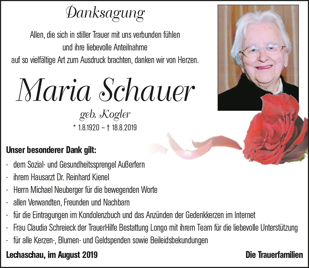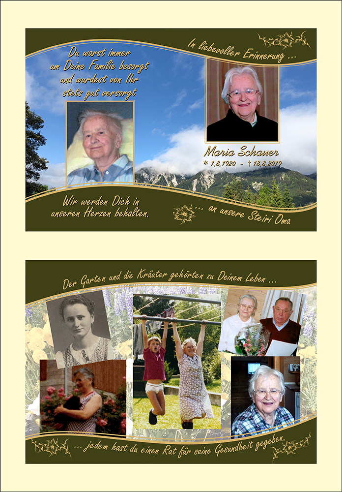 Wir alle hinterlassen in unserem Leben unauslöschliche Spuren und Abdrücke! Bei manchen Menschen ist das wie eine herrliche Symphonie, ein wunderschönes Bild! Maria wird in unseren Herzen bis zu einem Wiedersehen in Erinnerung bleiben! Nur die feste Hoffnung auf ein Wiedersehen in der Auferstehung vermag euch und uns Trost zu spenden!