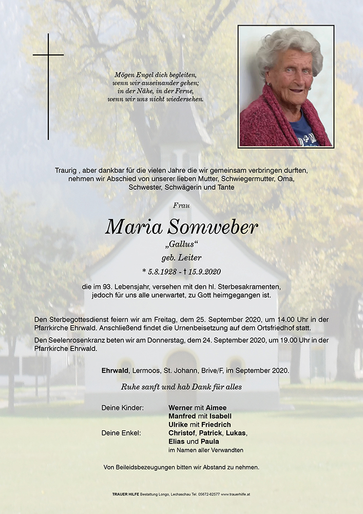 Nach einem erfüllten langen Leben ist eure Mama nun zu ihrem Schöpfer heimgekehrt. Wir werden sie als einen freundlichen immer der Sonne zugewandten Menschen in lieber Erinnerung behalten. In Gedanken sind wir bei euch Gerlinde und Hansi