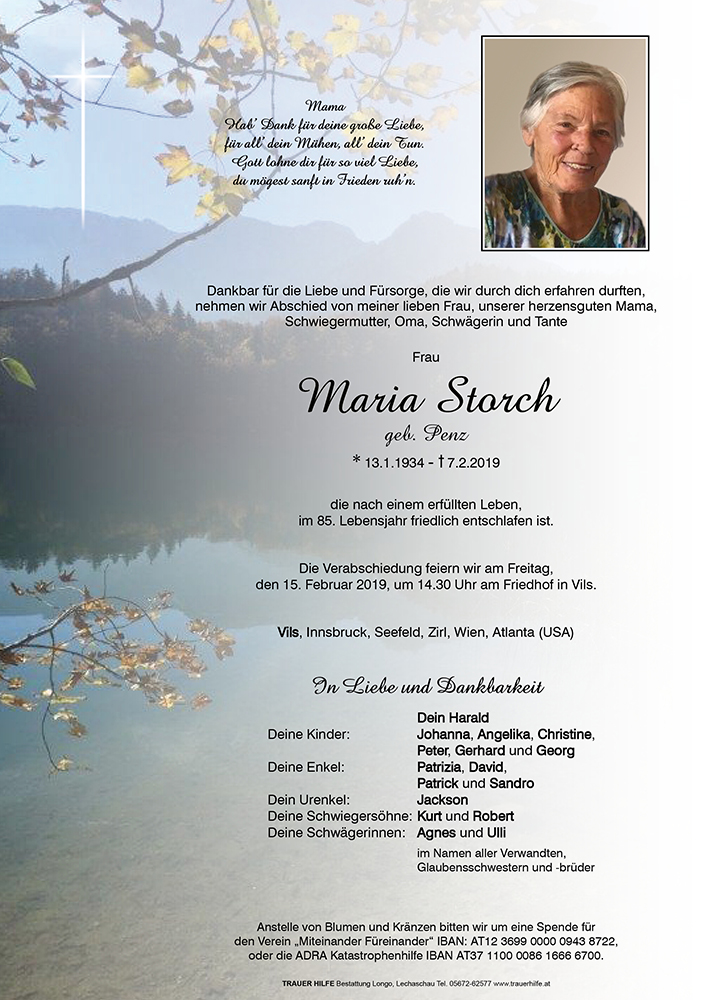 13.01.1934 07.02.2019 Vils Maria Storch Action Parte Sterbebild Gedenkkerzen Kondolenzen Parte Sterbebild Gedenkkerzen Kondolenzen Parte herunterladen Sterbebild herunterladen Gedenkkerzen für Maria Storch 96 Einträge Kerze anzünden Geborgen bei Gott! Seniorenresidenz Seefeld Karl und Ingrid Mages Markus u. Claudia Monitzer Familie Amann Familie Amann Smolei Lotte u. Klaudia Fam. Geyeregger Gitti Schrettl Das Team des SGS Außerfern Maria Petrini Carolin & Manne Werner und Rosa Friedl Fam. Hohenrainer Gerhard Sabine und Christian Meindel Fritz Bubendorfer Helmut und Margarete Ostheimer Romana & Helmut Ostheimer Barbara u. Mario Rief Fam. Triendl Hans Herbert u. Fridolina Vogler Martin, Christina, Matthias, Pius Ruhe in Frieden Petra G. Manuela und Hans Guppenberger Helmut und Elsmarie Huter Gerlinde Haunsberger Hubert Tröber mit Familie Ilse u. Armin Erd Fam. Reis Alfred u. Cilli Ledl Herta und Pius karner ingrid Helga Schnitzlbaumer/ Edi Hosp Hanni & Franz Kögl Gerhard u. Annelies Steurer Fam. Rudi & Erika Petz Ruhe in Frieden Edith M. Fam. Keller Ernst Florian Fischer mit Familie Lena und Thomas Petra Hengg Bernhard u. Brigitte Triendl Fam. Gruber Adolf Götsch Ingrid Melekusch Erika u. Helmut Lewisch Ulli u. Dietmar Hosp Fam. Ernst Schretter Fam. Kurt Lachmair Maria u. Günther Beyrer Bruno und Petra Schrettl Christiane Maier Fam. Rita u. Georg Gruber Familie Irmgard Schedle Claudia Klaunzer Manfred u. Uschi Megele Fam. Michael & Ulli Erd Annemarie Tröber Mali + Horst Meindel Walter u. Bettina Ahorn Fam. Gassmann Fam. Lechleitner Egon Anita und Helmut Frick Reinhard mit Familie Häselgehr Fam. Paul und Annemarie Kaiser Gerhard und Beatrix Monitzer Miteinander-Füreinander Manfred u. Annelies Wachter Fam. Markus & Andrea Schretter Christian und Isa Gerhard und Hermelinde Kien Andrea und Frank Harnos Beate Melmer Fam. Lochbihler Kurt Licht und Friede Bernhard & Conny Strigl Christa Abfalter Heidi und Helmut Abfalter Leopold u. Silvia Wörle Sissi und Markus Erd Fam. Überegger Pepi u. Gisela Gschwend Fam. Franz Lochbihler Alfred & Melitta Ginther Ruhe in Frieden Georg u. Monika Vogler Sonja und Günther Köchl Irmgard und Rudolf Pürcher Lilli Ostheimer Wolfgang und Elisabeth Roth Elsa Kaiser (Lochbihler) Margit und Burghard Gschwend Sonja und Erwin Haselwanter Ingrid u. Gebhard Lorenz Claudia Schreieck TrauerHilfe Bestattung Longo Ihre Gedenkkerze fürMaria Storch Ihr Name* Farbe auswählen Ihre Nachricht oder Name* E-Mail-Adresse* Mit dem Klicken auf "Kerze anzünden" erklären Sie sich mit unseren Datenschutzbestimmungen einverstanden. Kondolenzbuch für Maria Storch 1 Eintrag Kondolenz verfassen Lieber Peter! Aufrichtige Anteilnahme zum Heimgang deiner Mutter, entbietet dir Dietmar Wachter Dietmar Wachter 08.02.2019 um 16:17 Uhr Ihr Abschiedsgruß an Maria Storch Ihr Name* E-Mail-Adresse* Ihre Nachricht* Mit dem Klicken auf "Gruß absenden" erklären Sie sich mit unseren Datenschutzbestimmungen einverstanden.