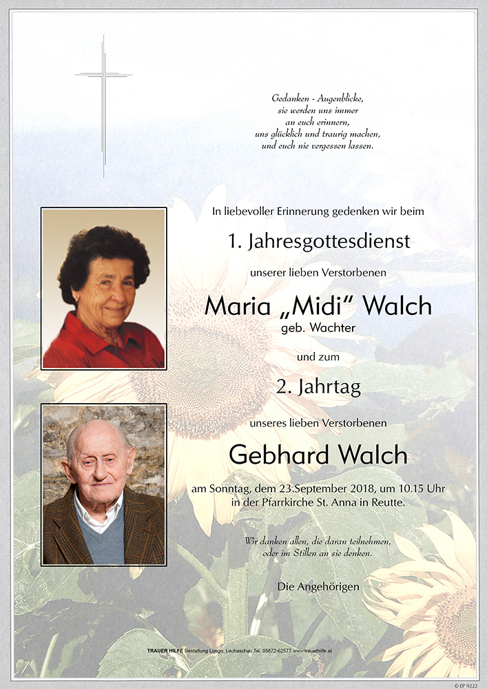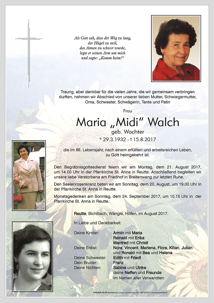 Ich erinnere mich an eure Mama gern zurück. Wir haben viel miteinander geplaudert und gelacht, war´s nach der Messe, oder wenn ich mit dem Kinderwagen am Walchhaus vorbeispaziert bin und Midi saß auf ihrem "Bänklein" . Wir hatten uns immer was zu erzählen.
