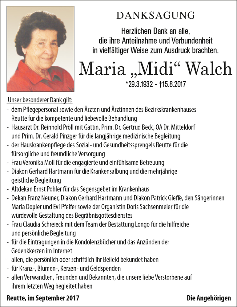 Mein aufrichtiges Beileid! Auch ich habe sehr schöne warme Erinnerungen im Hause Walch an die Tant Midi ! Ruhe in Frieden!