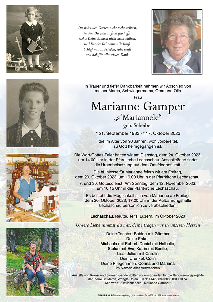 Gerne denken wir an die vielen schönen Stunden mit dem „Mariannele“, an ihre überaus herzliche, fröhliche Art! Marianne war ein „besonders wertvoller“ Mensch mit fast „grenzenloser Nächstenliebe“! Ihre jahrzehntelangen, großzügigen, anstrengenden, persönlichen Hilfseinsätze in Afrika möge ihr Gott vielfach belohnen! Wir durften ihre Hilfswerke persönlich unterstützen und es war für uns stets eine Freude, wenn sie mit großer Begeisterung und „leuchtenden Augen“ über „IHRE afrikanischen Kinder“ Bericht erstattete oder u.a. auch begeistert erzählte, was Robert für sie gutes gekocht hatte, oder Colin für sie gemalt oder gebastelt hat!