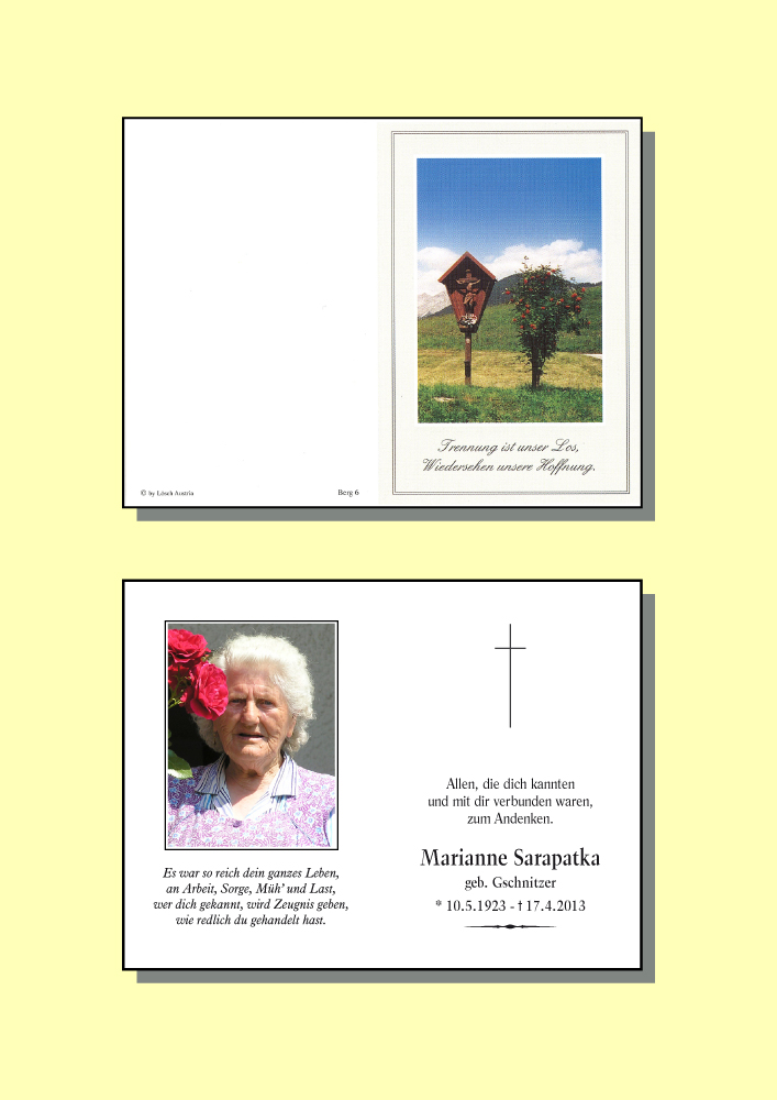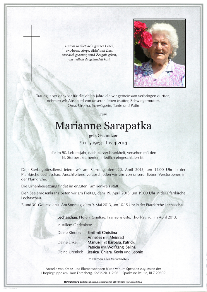 Zum Ableben eurer lieben Mutter Marianne möchte ich euch mein aufrichtiges Beileid und mein tiefstes MItgefühl ausdrücken. Ich wünsche euch viel Kraft in diesen schweren Stunden.