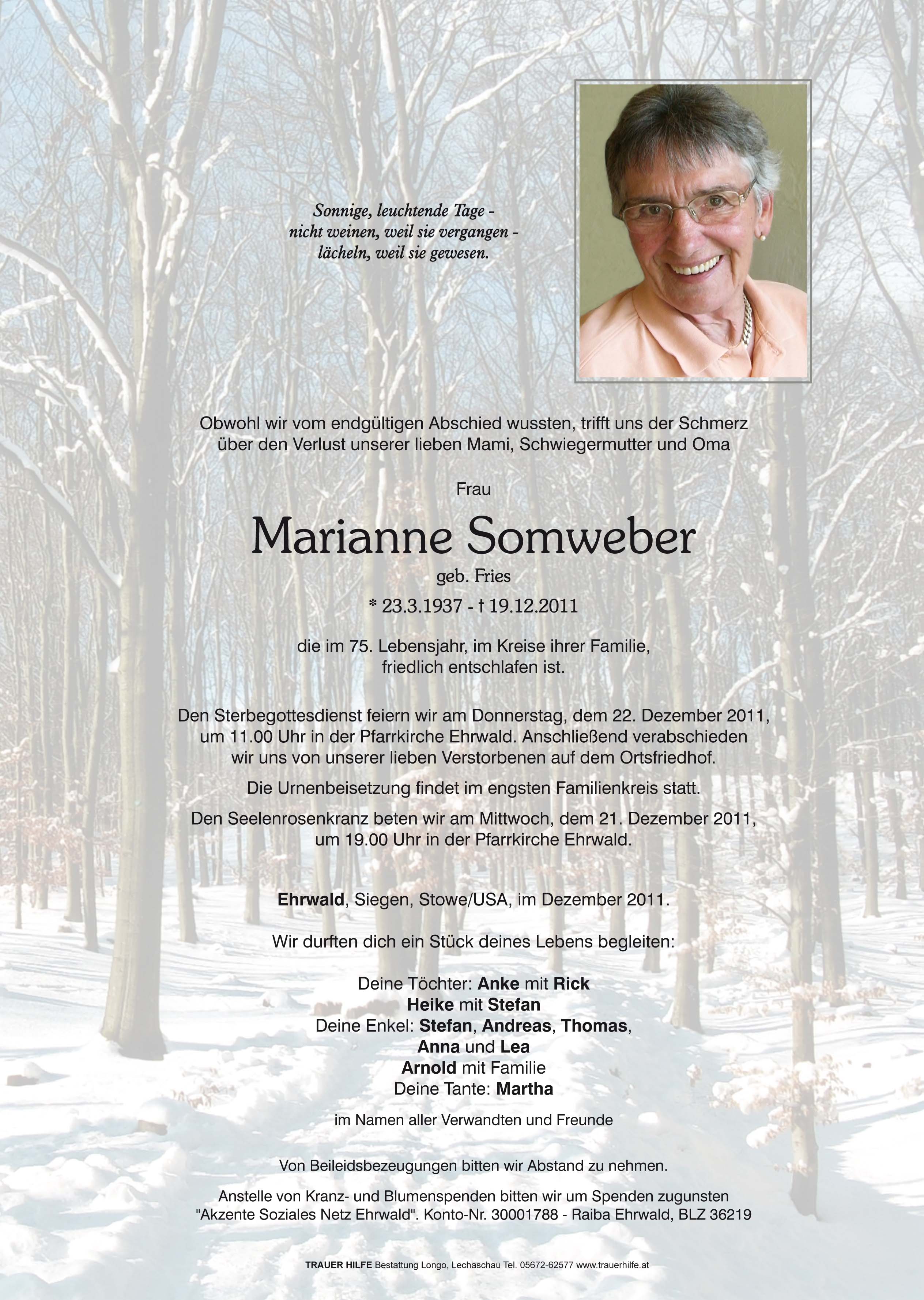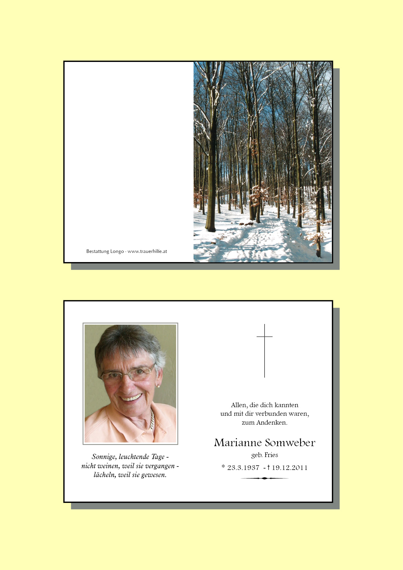 Aufrichtige Anteilnahme zum Tod Eurer Mutter. Vielleicht war es auch Erlösung für Marianne, das Leiden war schon sehr groß.Gerne erinnern wir uns an sie.