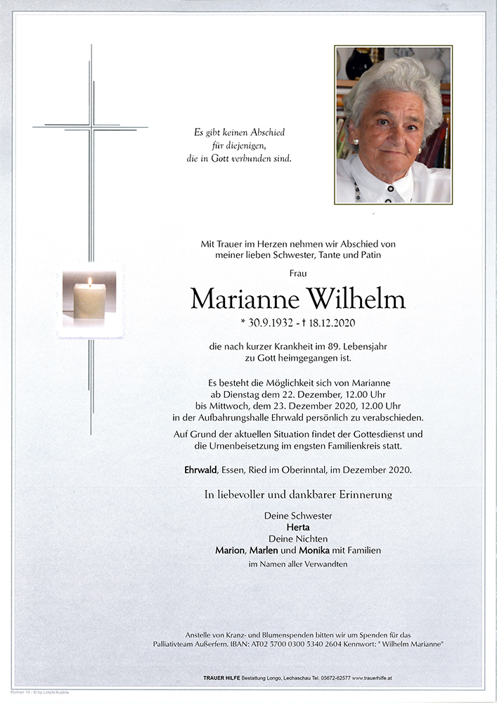 Liebe Trauerfamilie, wir trauern mit euch um unsere Tante Marianne und wünschen euch viel Kraft in diesen schweren Tagen .