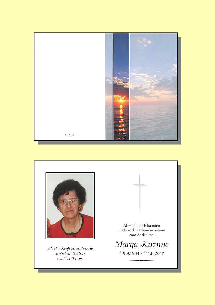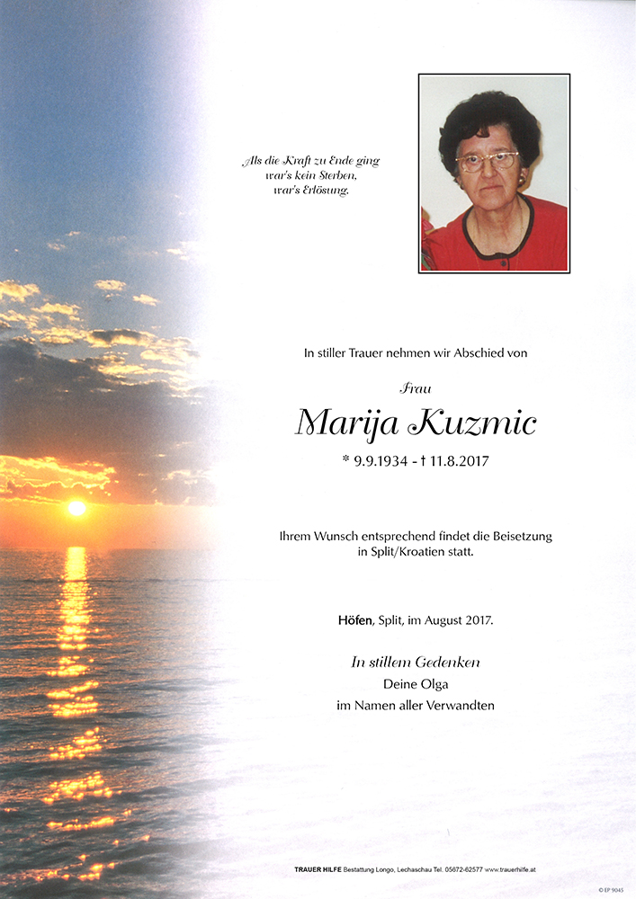Das Schwerste auf der Welt ist Abschied zu nehmen. Wir werden nicht gefragt, wann es uns recht ist Abschied zu nehmen von einem Menschen, der uns viele Jahre unseres Lebens begleitet hat. Marija war eine liebe Arbeitskollegin von der man viel lernen konnte; Freundlichkeit, Sorgsamkeit , Korrektheit und Menschlichkeit . Als Krankenschwester waren diese wertvollen Eigenschaften sehr hilfreich. Liebe Olga, im Gebet für Marija verbunden werde ich ihr ein würdiges Andenken bewahren. Gott gebe dir Kraft und Hoffnung den schmerzlichen Verlust deiner treuen Freundin zu ertragen. Denke daran: Dei Trauer ist nicht eine Folgeerscheinung unseres Schmerzes, sondern bereits sein Heilmittel. In stiller Anteilnahme Ricky