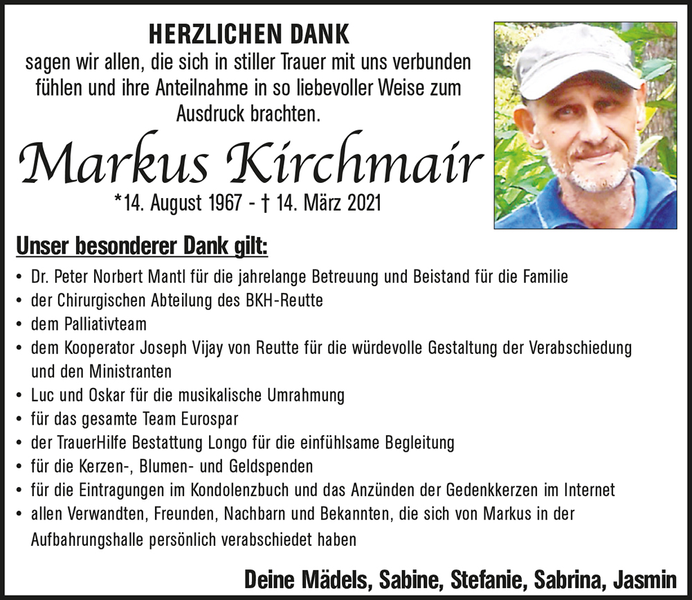Ich bin unendlich froh , das wir uns letztes Jahr noch so oft getroffen haben ! Meistens du alleine oder mit Sabine. Wir haben über deine Krankheit gesprochen, die du mit bewundernswerter Stärke ertragen hast!!! Auch über deine geliebten Mädl\'s auf die du so stolz warst! Ich danke dir heute noch das du öfter Roland und Papa zu Hause besucht hast ,das werde ich nie vergessen und behalte dich immer als freundlichen und lustigen COUSIN in Erinnerung!!!!! Hab\'s fein im Himmel lieber Markus!!
