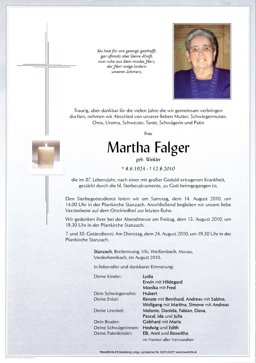 13.12.1901 12.08.2010 Stanzach Martha Falger Action Parte Sterbebild Gedenkkerzen Kondolenzen Parte Sterbebild Gedenkkerzen Kondolenzen Parte herunterladen Sterbebild herunterladen Gedenkkerzen für Martha Falger 2 Einträge Kerze anzünden Familie Hörting martina dornacher mit familie Ihre Gedenkkerze fürMartha Falger Ihr Name* Farbe auswählen Ihre Nachricht oder Name* E-Mail-Adresse* Mit dem Klicken auf "Kerze anzünden" erklären Sie sich mit unseren Datenschutzbestimmungen einverstanden. Kondolenzbuch für Martha Falger 0 Einträge Kondolenz verfassen Ihr Abschiedsgruß an Martha Falger Ihr Name* E-Mail-Adresse* Ihre Nachricht* Mit dem Klicken auf "Gruß absenden" erklären Sie sich mit unseren Datenschutzbestimmungen einverstanden.