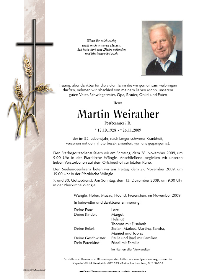 13.12.1901 26.11.2009 Wängle Martin Weirather Action Parte Gedenkkerzen Kondolenzen Jahrestag Parte Gedenkkerzen Kondolenzen Jahrestag Parte herunterladen Gedenkkerzen für Martin Weirather 9 Einträge Kerze anzünden Thomas und Kilian Witting elisabeth Sandra mit liam u. Leon Alles Liebe dein Enkel Manuel Für Opa, dein Tobias Ruhe in Frieden Dein Enkelkind Manuel Dein Enkelkind Manuel Wachter Dietmar Ihre Gedenkkerze fürMartin Weirather Ihr Name* Farbe auswählen Ihre Nachricht oder Name* E-Mail-Adresse* Mit dem Klicken auf "Kerze anzünden" erklären Sie sich mit unseren Datenschutzbestimmungen einverstanden. Kondolenzbuch für Martin Weirather 2 Einträge Kondolenz verfassen Lieber Opa! Ich werde dich immer in meinem Herzen tragen. Dein Tobias Tobias Weirather 24.08.2015 um 22:34 Uhr Lieber Opa ich vermisse dich sehr Manuel Weirather 08.03.2012 um 16:26 Uhr Ihr Abschiedsgruß an Martin Weirather Ihr Name* E-Mail-Adresse* Ihre Nachricht* Mit dem Klicken auf "Gruß absenden" erklären Sie sich mit unseren Datenschutzbestimmungen einverstanden. Jahrestag herunterladen