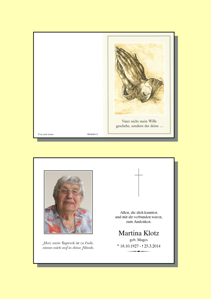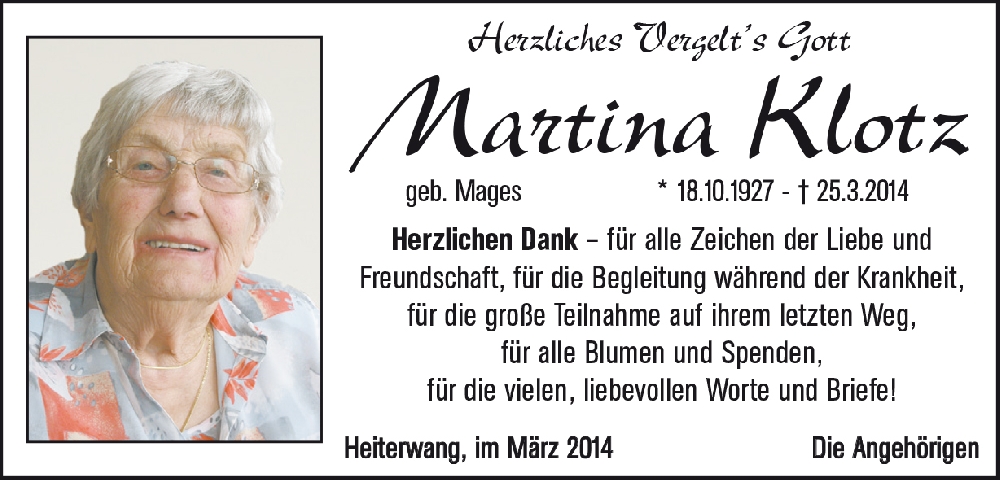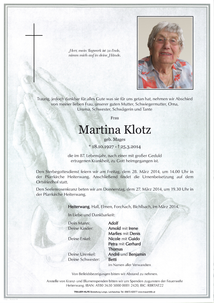 Seid nicht traurig, dass Eure liebe Martina von Euch gegangen ist. Freut Euch, dass sie so lange bei Euch sein konnte.