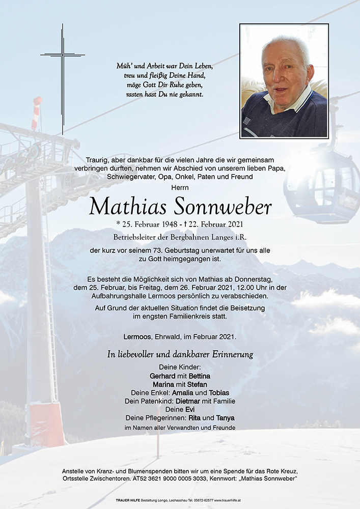 Pfiati Mathias, leb wohl lieber Freund. Da wo Du hingehst scheint immer die Sonne für Dich. Und sag unserem Sigi liebe Grüße!