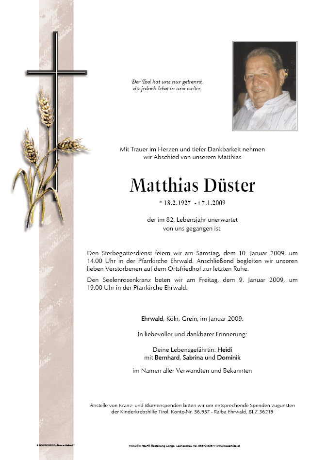 13.12.1901 07.01.2009 Ehrwald Matthias Düster Action Parte Gedenkkerzen Kondolenzen Parte Gedenkkerzen Kondolenzen Parte herunterladen Gedenkkerzen für Matthias Düster 1 Eintrag Kerze anzünden Ein Licht für die Ewigkeit! Ihre Gedenkkerze fürMatthias Düster Ihr Name* Farbe auswählen Ihre Nachricht oder Name* E-Mail-Adresse* Mit dem Klicken auf "Kerze anzünden" erklären Sie sich mit unseren Datenschutzbestimmungen einverstanden. Kondolenzbuch für Matthias Düster 0 Einträge Kondolenz verfassen Ihr Abschiedsgruß an Matthias Düster Ihr Name* E-Mail-Adresse* Ihre Nachricht* Mit dem Klicken auf "Gruß absenden" erklären Sie sich mit unseren Datenschutzbestimmungen einverstanden.