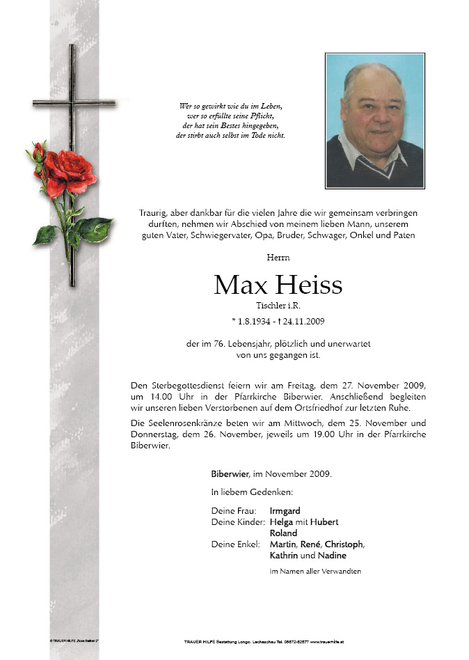 13.12.1901 24.11.2009 Biberwier Max Heiss Action Parte Gedenkkerzen Kondolenzen Parte Gedenkkerzen Kondolenzen Parte herunterladen Gedenkkerzen für Max Heiss 4 Einträge Kerze anzünden Hosp Josef hosp josef hosp josef hosp josef biberwier Ihre Gedenkkerze fürMax Heiss Ihr Name* Farbe auswählen Ihre Nachricht oder Name* E-Mail-Adresse* Mit dem Klicken auf "Kerze anzünden" erklären Sie sich mit unseren Datenschutzbestimmungen einverstanden. Kondolenzbuch für Max Heiss 0 Einträge Kondolenz verfassen Ihr Abschiedsgruß an Max Heiss Ihr Name* E-Mail-Adresse* Ihre Nachricht* Mit dem Klicken auf "Gruß absenden" erklären Sie sich mit unseren Datenschutzbestimmungen einverstanden.