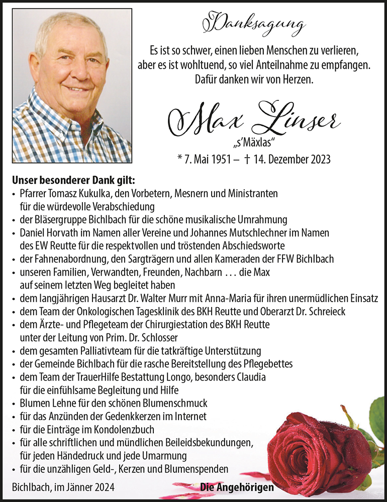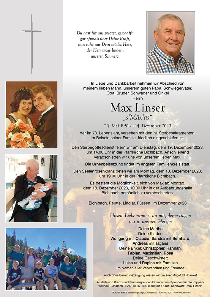 Zum Verlust von Max möchten wir euch unsere Aufrichtige Anteilnahme aussprechen. Ich kann mich noch gut erinnern wenn wir nach Bichlbach kamen und er uns sah und immer Zeit zum erzählen da war. Wir wünschen euch viel Kraft und viele schöne Erinnerungen um den Schmerz erträglich zu machen.