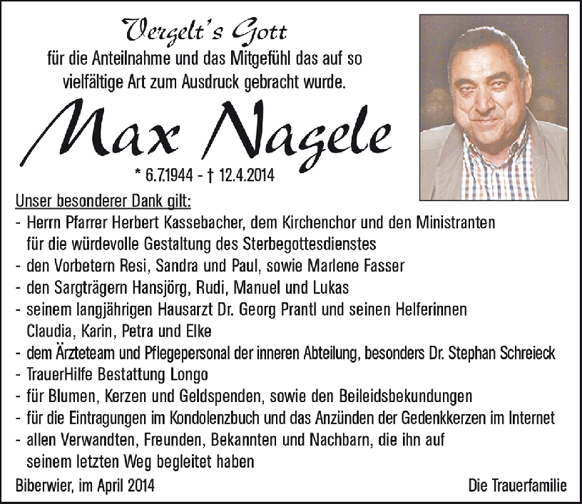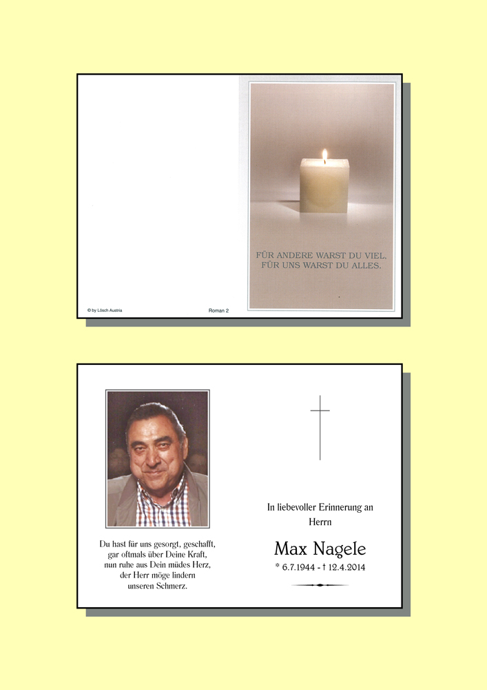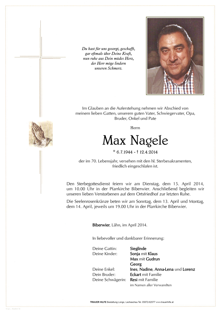 liebe familie nagele, lieber georg! in dieser schweren zeit denke ich besonders oft an euch . herzliche anteilnahme christl tscharnuter mit familie.