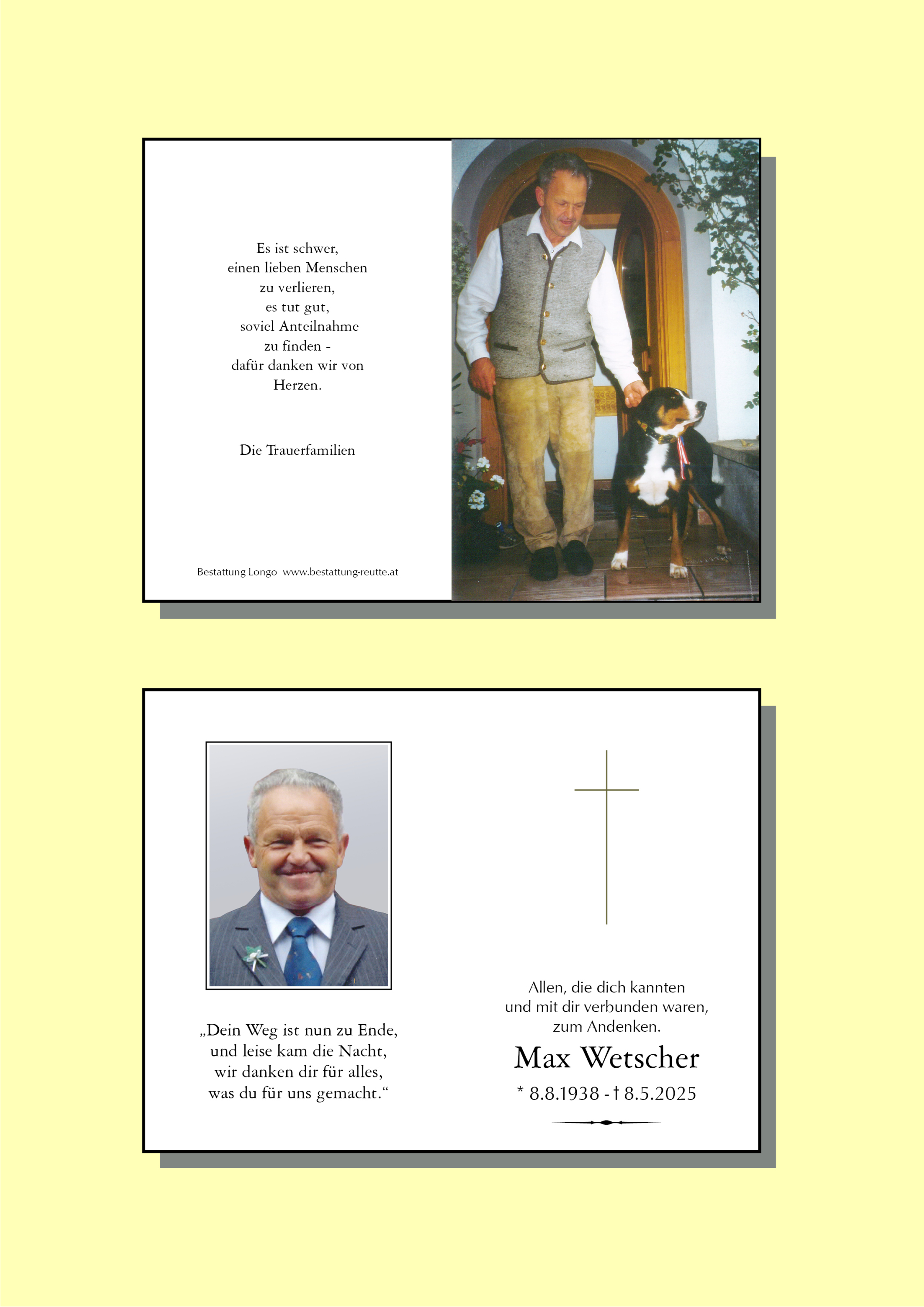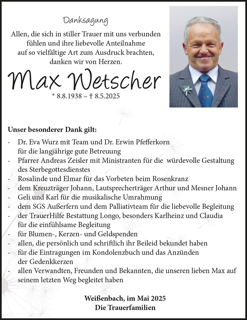 Die Ortsgruppe Weissenbach des Pensionistenverbands möchte euch zum Ableben von Max die herzliche Anteilnahme entgegenbringen. Max war ein langjähriges Mitglied unserer Ortsgruppe. Er war mit seiner freundlichen Art und seinem netten Unterlandler Dialekt ein gern gesehener Teilnehmer bei den Veranstaltungen und Reisen.