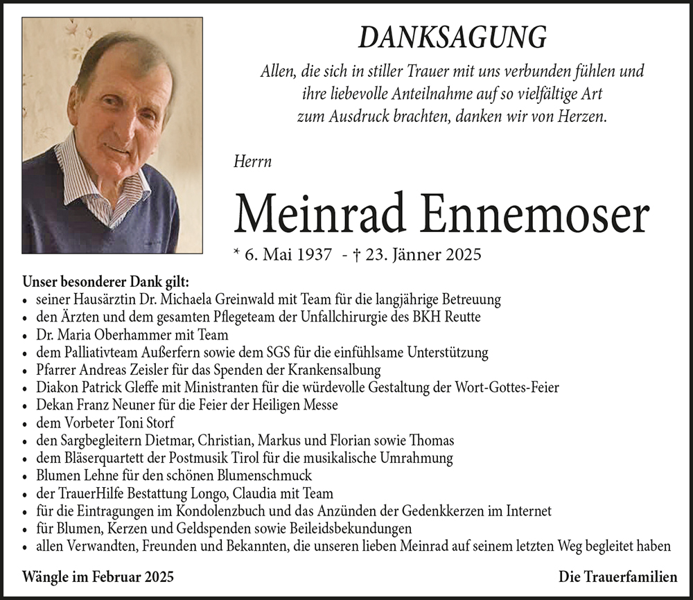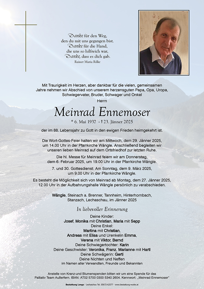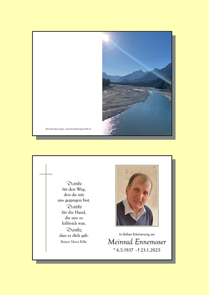 Liebe Trauerfamilie! Es ist immer zu früh wenn ein guter Freund durch die Tür auf die andere Seite geht.Meinrad war immer gut gelaunt und hatte immer Zeit für ein paar Worte obwohl er immer streng bei der Arbeit war.Wir werden dich so wie Du warst ( immer mit einem Lächeln im Gesicht) steht\'s in Erinnerung behalten.Ruhe in Frieden ????️