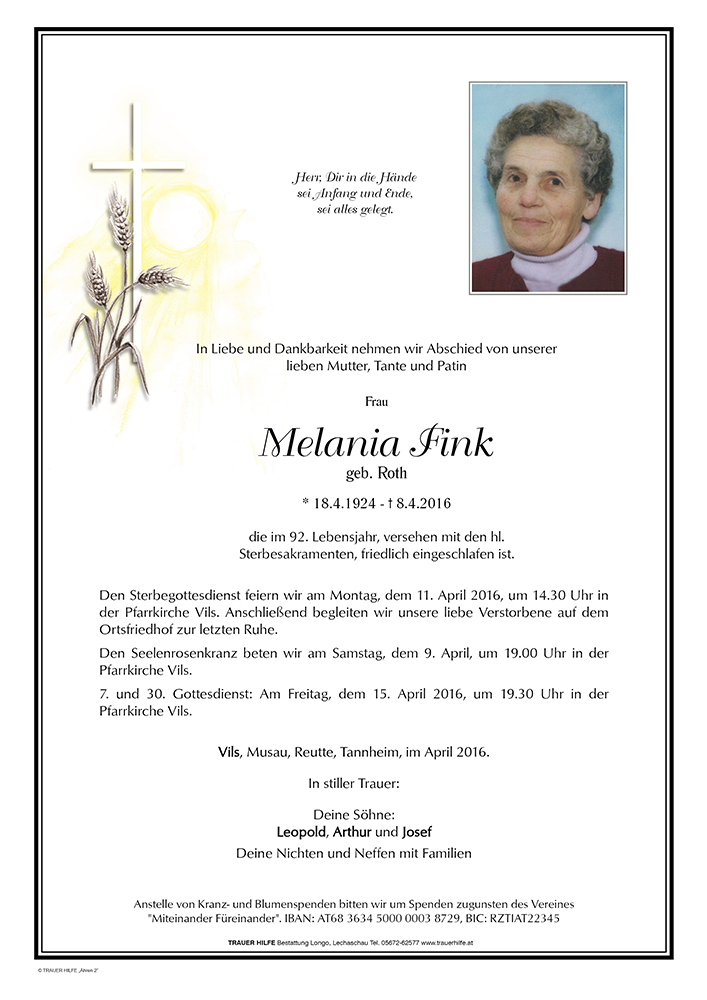 18.04.1924 08.04.2016 Vils Melania Fink Action Parte Sterbebild Gedenkkerzen Kondolenzen Parte Sterbebild Gedenkkerzen Kondolenzen Parte herunterladen Sterbebild herunterladen Gedenkkerzen für Melania Fink 101 Einträge Kerze anzünden in liebevoller Erinnerung Licht & Freude der besten Tota Licht zu Allerheiligen f. Tota Für die beste Tota. . . DANKE zum 1. Jahrtag Maria B. Bitte für deine Lieben lb. Tota Du fehlst uns lb. Tota. in liebem Gedenken Das ewige Licht leuchte dir Wir vermissen dich! Du fehlst mir lb. Tota! In liebevoller Erinnerung! In liebem Gedenken In stillem Gedenken Martha und Franz Wiesinger Hedwig Ruhe in Frieden Fam. Triendl Hans Gitti Schrettl Fam. Tanja u. Markus Kögl Claudia Klaunzer Georg u. Monika Vogler Doris Lewisch mit Familie Fm. Köchl Sonja und Günther Fam. Pumeneder Hans Weilharter Franz u. Hanni Kögl O Herr, gib Ihr die ewige Ruhe Ein Licht für dich Edith M. Michael Steiner Fam. Paul Vogler Fam. Klaudia Schmid Leopold u Petra Vogler In Liebe und Dankbarkeit Fam. Singer Wolfgang Ruhe in Frieden Petra G. für immer im Herzen Willi & Lydia Peter Uschi Julius Rid Rudolf und Sieglinde Zotz Otto und Dari Annelies u. Gerhard Steurer Margareta Ostheimer Bert u. Anne Wörle Fam. Keller Ernst Astrid und Dieter Wege FamLechleitner Egon Familie Pitterle Christian u. Brigitte Keller Reinhard Kathrein Marita u. Helmut Schädle Margit und Burghard Gschwend Familie Gerhard Megele Daniela & Walter Lechleitner Robert und Hannelore Beirer Helene Sonnweber Weißenb. Caroline Lechleitner mit Fam. Fam. Kögl Franz Unvergessen Karin und Emma Schretter Gitti, Ingrid und Pepi m. Fam. Florian Fischer mit Familie Martin & Heike Gassmann Gerlinde Haunsberger Reini Lochbihler Bernhard & Conny Strigl Andrea Abraham m. Fam. Christa Abfalter Walter u. Bettina Ahorn Ewig dankbar lb. Tota Andrea Erd mit Fam. Gerhard und Hermelinde Kien Willi u Elsa Kaiser Ruhe in Frieden Fritz Bubendorfer Martha und Franz Wiesinger Adi und Ingrid Fam. Georg Neuner Angelika Roth m. Familie Lisi & Wolfgang Roth Helga Schnitzlbaumer Fam. Erika u. Rudi Petz Fam. Guido Galley Lilli Ostheimer Kathrin und Markus Famil. Engl Ulli u. Dietmar Hosp Thomas, Doris, Lisa u. Anja Klaus u. Susanne Dirr Leopold u. Silvia Wörle Hermine & Emil Wachter Ruhe in Frieden Flo Fam. Lochbihler Kurt Maria Beyrer m. Familie Familie Haselwanter Andrea, Frank u. Raphael Claudia Schreieck Claudia Hohenrainer TrauerHilfe Bestattung Longo Ihre Gedenkkerze fürMelania Fink Ihr Name* Farbe auswählen Ihre Nachricht oder Name* E-Mail-Adresse* Mit dem Klicken auf "Kerze anzünden" erklären Sie sich mit unseren Datenschutzbestimmungen einverstanden. Kondolenzbuch für Melania Fink 0 Einträge Kondolenz verfassen Ihr Abschiedsgruß an Melania Fink Ihr Name* E-Mail-Adresse* Ihre Nachricht* Mit dem Klicken auf "Gruß absenden" erklären Sie sich mit unseren Datenschutzbestimmungen einverstanden.