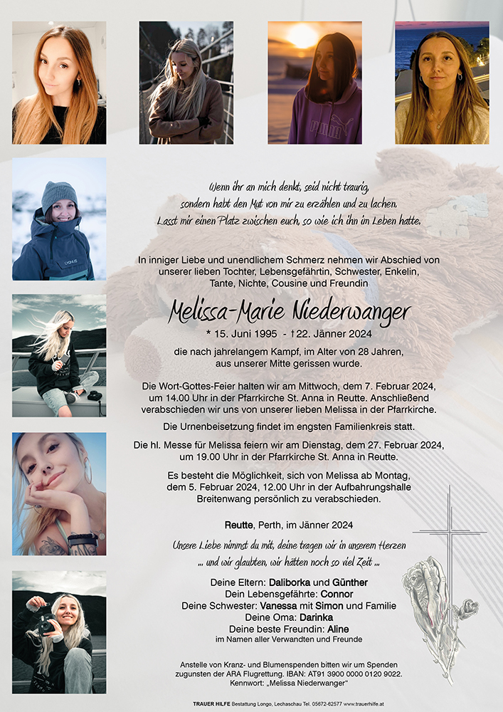In tiefer Betroffenheit haben wir vom Tode unserer Absolventin Melissa-Marie Niederwanger, die im Jahr 2013 bei uns die Bundeshandelsschule abgeschlossen hat, erfahren.