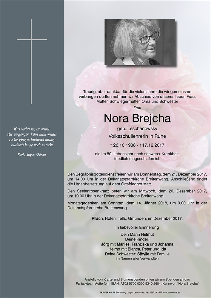 Gemeinsam mit eurer Nora besuchte ich zwei Jahre lang die Pädagogische Akademie in Zams. Meine Erinnerungen an diese Zeit sind unwillkürlich mit Nora verbunden, die ein liebevoller und wunderbarer Mensch war. Wir hatten so viele lustige Erlebnisse, sie strahlte Wärme und Herzlichkeit aus und dieses Andenken wird für immer in meinem Herzen bleiben.