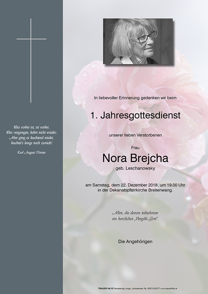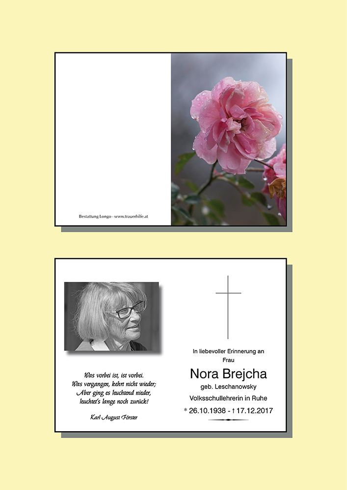 obwohl ich natürlich von Deiner schweren Krankheit wußte, macht mich Dein Tod sehr traurig. Dein Humor, den ich über Jahre miterleben durfte, war einzigartig. Leider kann ich wegen einer Hüftoperation weder dem Rosenkranz noch der Verabschiedung beiwohnen. Ich werde aber in Gedanken dabei sei n.Liebe Nora, ruhe in Frieden!